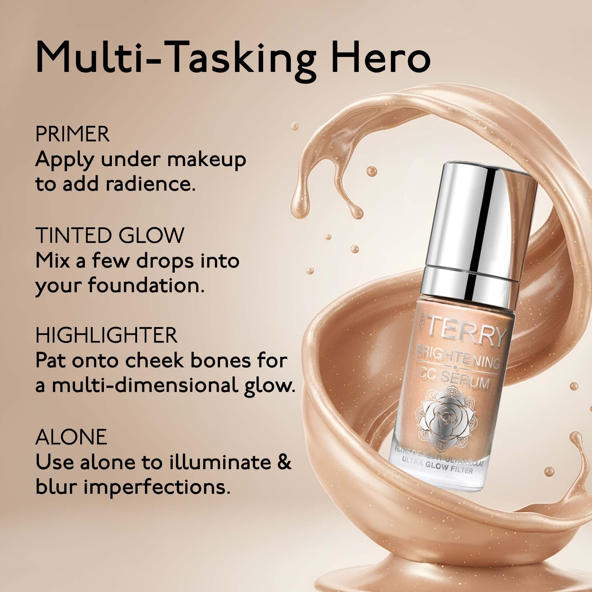 By Terry Cellularose CC Serum est une base de teint correctrice et illuminatrice dans un soin sublimateur hydratant pour un teint unifié, rayonnant, aux imperfections gommées. Le sérum CC Illuminateur culte a été soigneusement réinventé avec une formule végane d’origine naturelle, désormais enrichie en actifs de soin puissants pour des résultats encore plus visibles. Au cœur de sa formule, l’extrait de rose japonaise aide à lisser, raffermir et revitaliser la peau en profondeur, tandis que l’extrait de rose de thé hydrate intensément, apaise et renforce la barrière cutanée délicate. Léger comme une plume et fluide, ce sérum hybride fond parfaitement sur la peau, corrige et illumine instantanément le teint pour un éclat naturel et frais.
