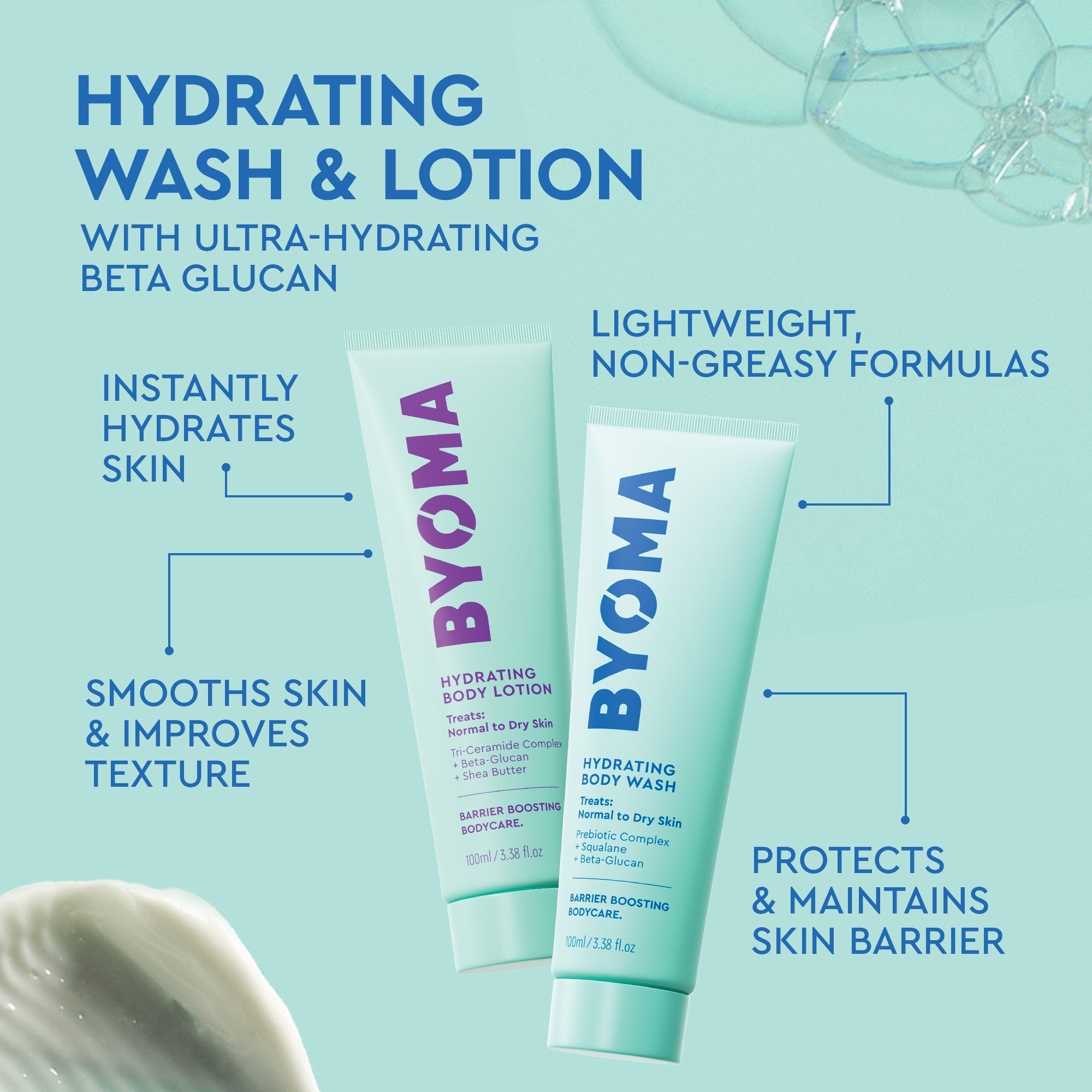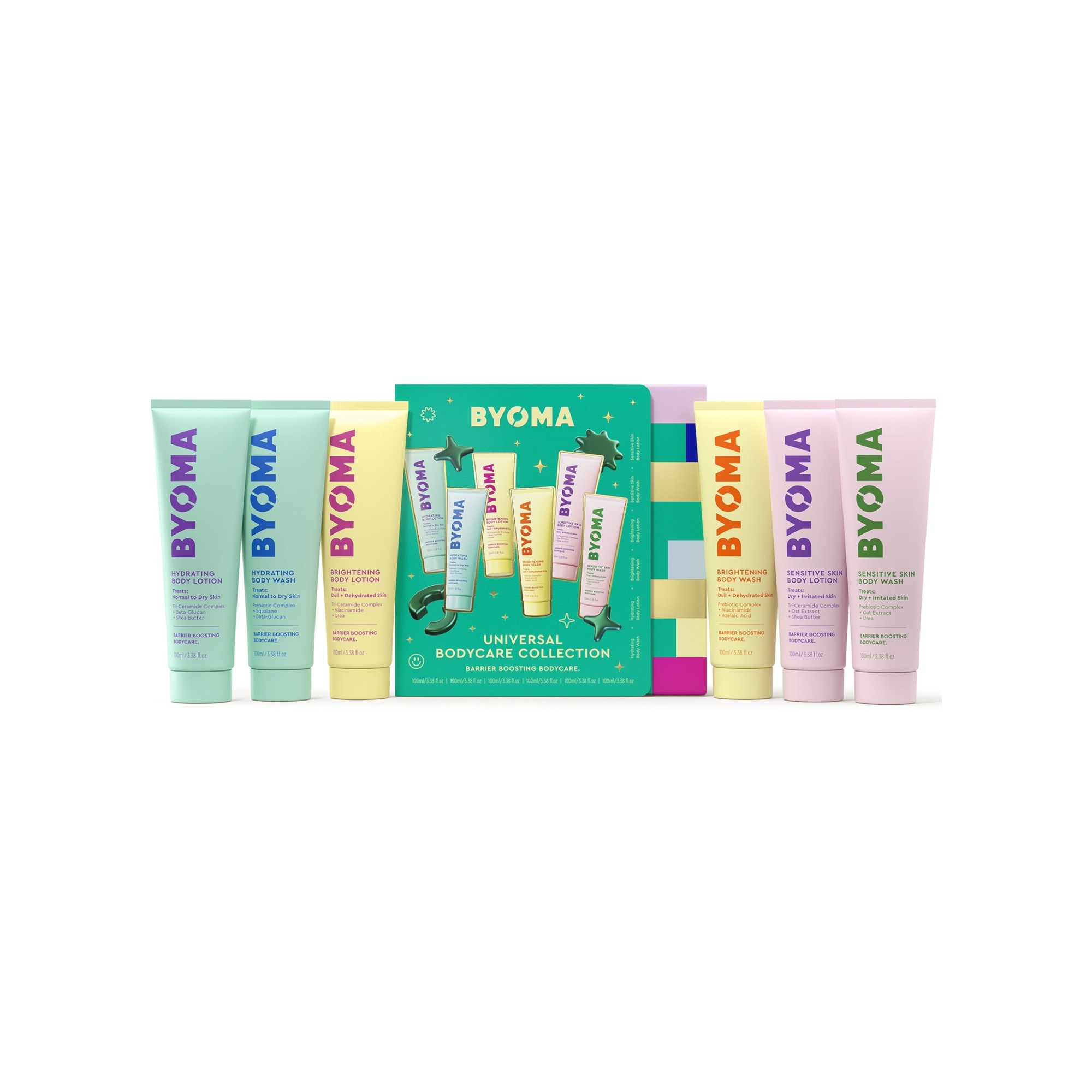 Byoma Universal Bodycare Collection est un coffret de soins corporels qui renforçe la barrière cutanée et qui réunit six formules de gels douche et lotions corporelles adaptées à tous les types de peau. Que vous recherchiez un teint plus lumineux, une hydratation nourrissante ou un apaisement pour peau sensible, ce coffret offre une solution pour chaque besoin. Formulés avec une multitude d’actifs doux mais efficaces, dont le Tri-Ceramide Complex de la marque, chaque duo gel douche et lotion nettoie et apaise, laissant la peau douce et souple après chaque utilisation. Le Hydrating Wash est un gel douche nutritif, enrichi en Squalane et Bêta-Glucane, qui hydrate intensément, stimule le microbiome cutané et scelle l’hydratation après la douche. La Hydrating Lotion est une lotion corporelle luxueuse et nourrissante, enrichie en Bêta-Glucane et beurre de karité, pour une peau visiblement plus douce et souple. Le Brightening Wash est un gel douche équilibré pH et illuminant, formulé avec Niacinamide et Acide Azélaïque, qui unifie le teint, illumine la peau et améliore la texture cutanée pour un résultat éclatant. La Brightening Lotion est une lotion corporelle légère et soyeuse, enrichie en Niacinamide et urée, qui éclaircit le teint tout en offrant une hydratation immédiate. Le Sensitive Wash est un gel douche doux au pH équilibré, formulé avec extrait d’avoine et urée, qui apaise la sécheresse tout en hydratant la peau. La Sensitive Lotion est une lotion corporelle sans parfum, enrichie en extrait d’avoine et beurre de karité, qui aide à soulager les rougeurs, irritations, démangeaisons et squames, pour un confort optimal des peaux sensibles.
