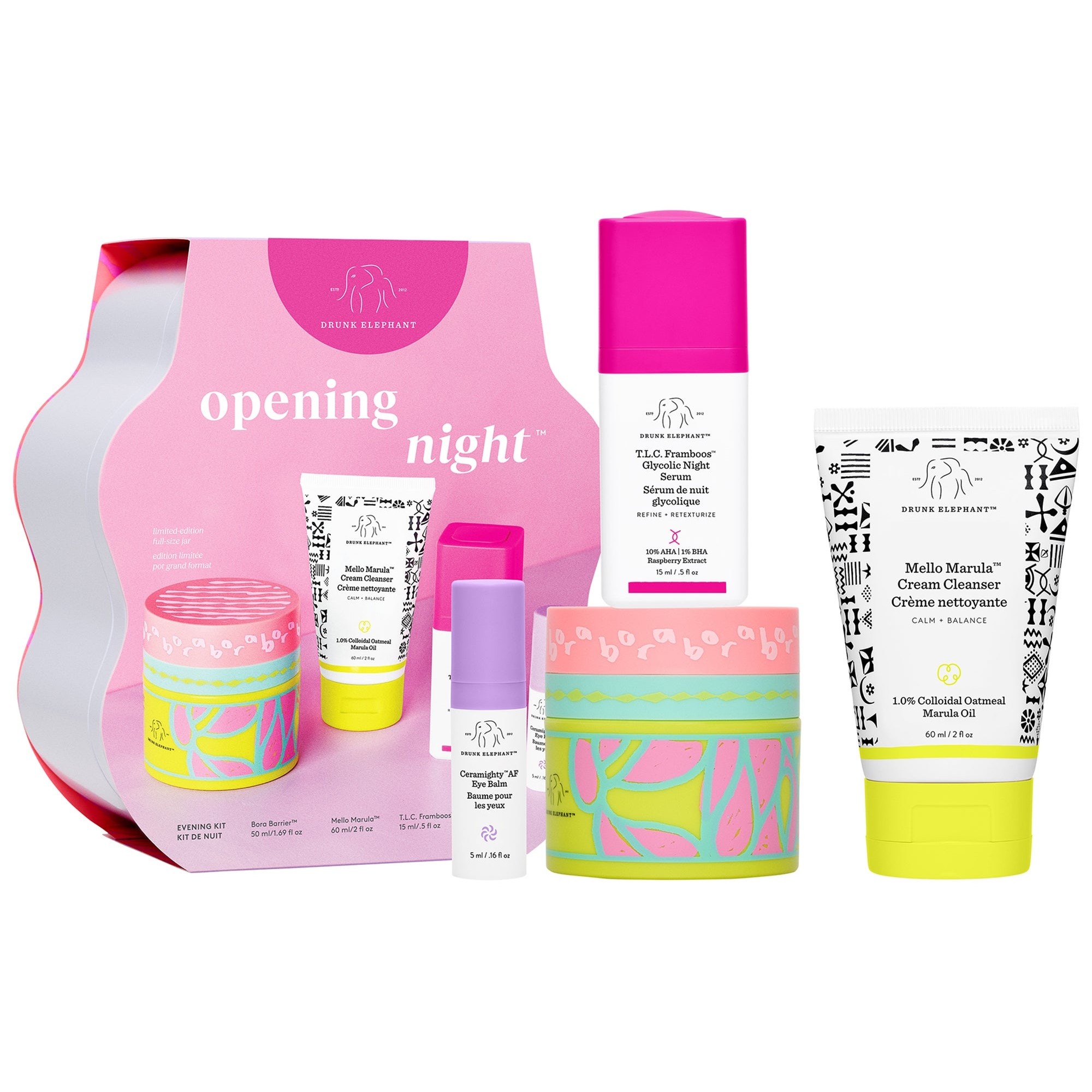 Drunk Elephant Opening Night Set est un coffret de quatre soins qui agissent pendant la nuit pour révéler une peau plus douce, plus lisse et visiblement reposée au réveil. Réveillez-vous avec une peau intensément hydratée grâce au Drunk Elephant Opening Night Kit. Au cœur du rituel, la Bora Barrier Repair Cream en format full size, une crème riche en peptides qui nourrit la barrière d’hydratation naturelle de la peau et contribue à lui redonner fermeté et souplesse. Elle est accompagnée de trois mini soins complémentaires pour une routine nocturne complète. En quatre étapes, ce rituel nourrit, régénère et renforce la peau pendant votre sommeil, laissant le teint frais, apaisé et prêt à affronter une nouvelle journée. Hydratez en profondeur, apaisez et lissez la peau avec le Drunk Elephant Opening Night : Evening Kit, un kit de soins qui comprend la Bora Barrier Repair Cream, le T.L.C. Framboos Glycolic Night Serum, le Ceramighty AF Eye Balm et la Mello Marula Cream Cleanser. Mello Marula Cream Cleanser agit pour calmer et équilibrer la peau tout en nettoyant les écrans solaires et le maquillage résistants à l'eau. Bora Barrier™ Repair Cream aide à restaurer la barrière cutanée, tandis que T.L.C. Framboos™ Glycolic Night Serum exfolie le teint. Le baume pour les yeux Ceramighty AF contribue à hydrater en profondeur le contour des yeux. Offrant une routine complète pour la soirée, le Drunk Elephant Opening Night Evening Kit convient à tous les types de peau.