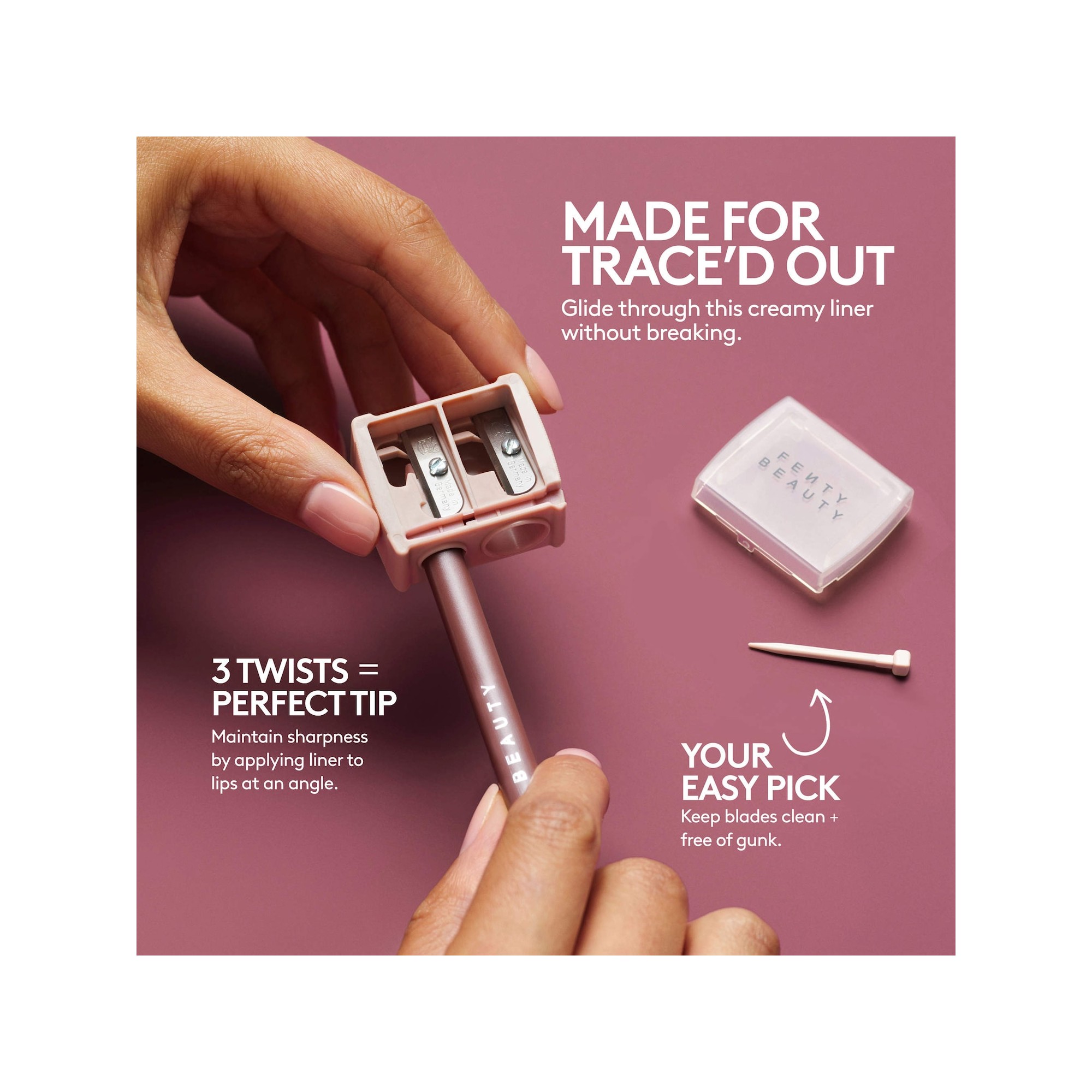 Fenty Beauty Trace'd Out Pencil Lip Liner Sharpener est un taille-crayon double qui redonne aux crayons à lèvres toute leur précision pour un résultat parfait en un simple tour de main. Place à la précision. La texture crémeuse que vous aimez tant avec Trace’d Out est préservée en partie grâce à son étui, qui aide à éviter le dessèchement et les accrocs à l’application. Ce taille-crayon à double ouverture a été spécialement conçu pour tailler facilement l’enveloppe extérieure, sans altérer votre crayon. De plus, le capuchon protecteur redonne à votre crayon à lèvres un tracé parfaitement net, sans salissures. La texture crémeuse que vous aimez tant avec Trace’d Out ? Elle reste intacte, notamment grâce à son étui non en bois qui prévient le dessèchement et les tiraillements. Ce taille-crayon à double réservoir a été conçu pour tailler l’enveloppe extérieure en toute simplicité, sans perturber la mine. Et grâce à son capuchon protecteur, votre crayon retrouve une pointe impeccable, sans dégâts. Obtenez une précision ultime en un tour de main. Ce taille-crayon double redonne aux crayons à lèvres toute leur précision.