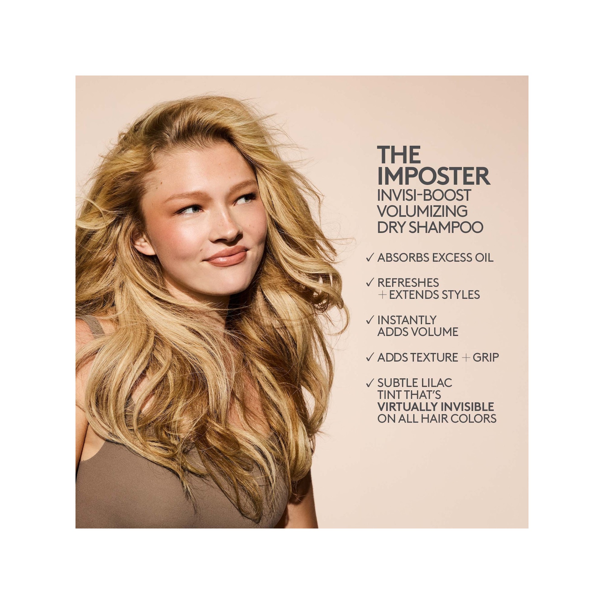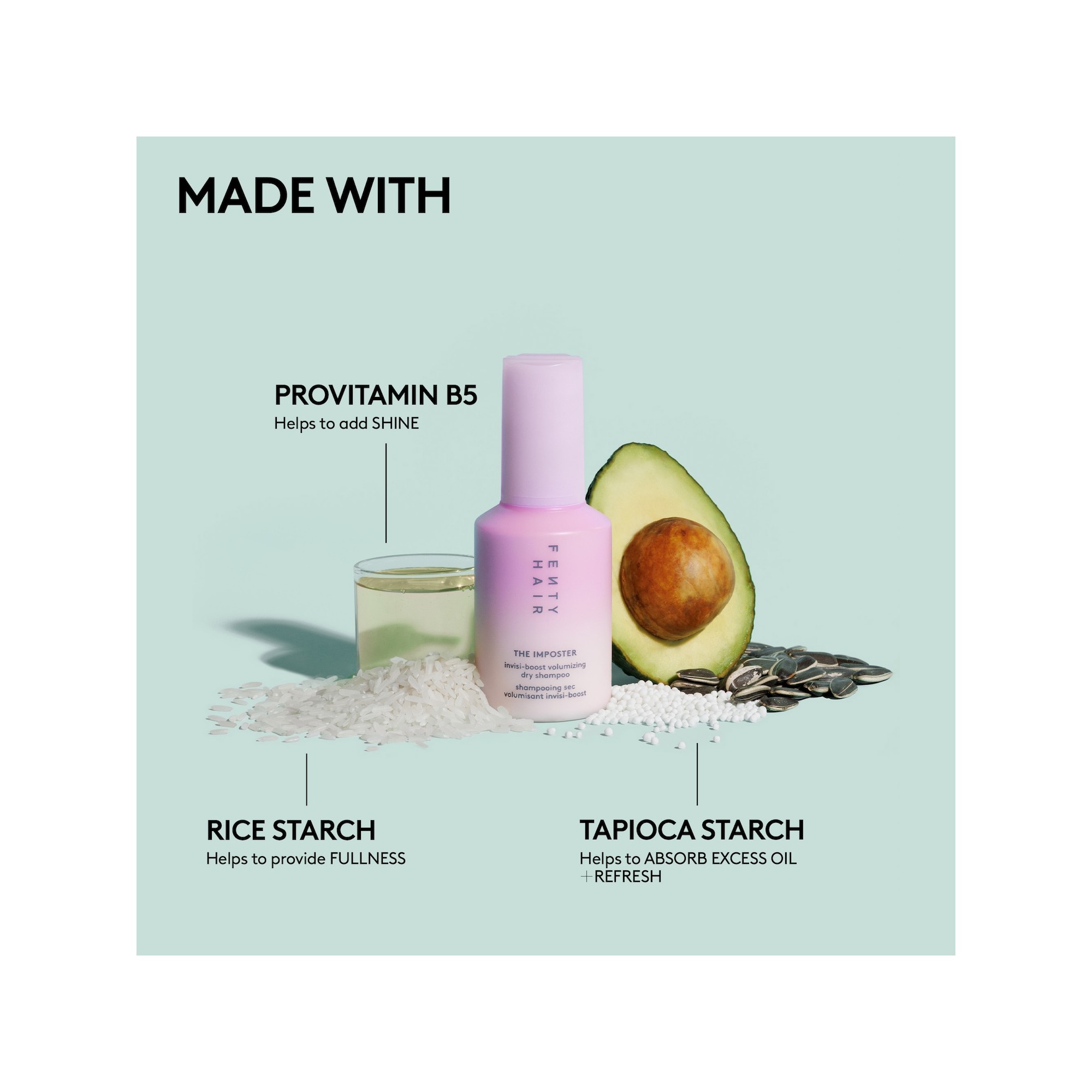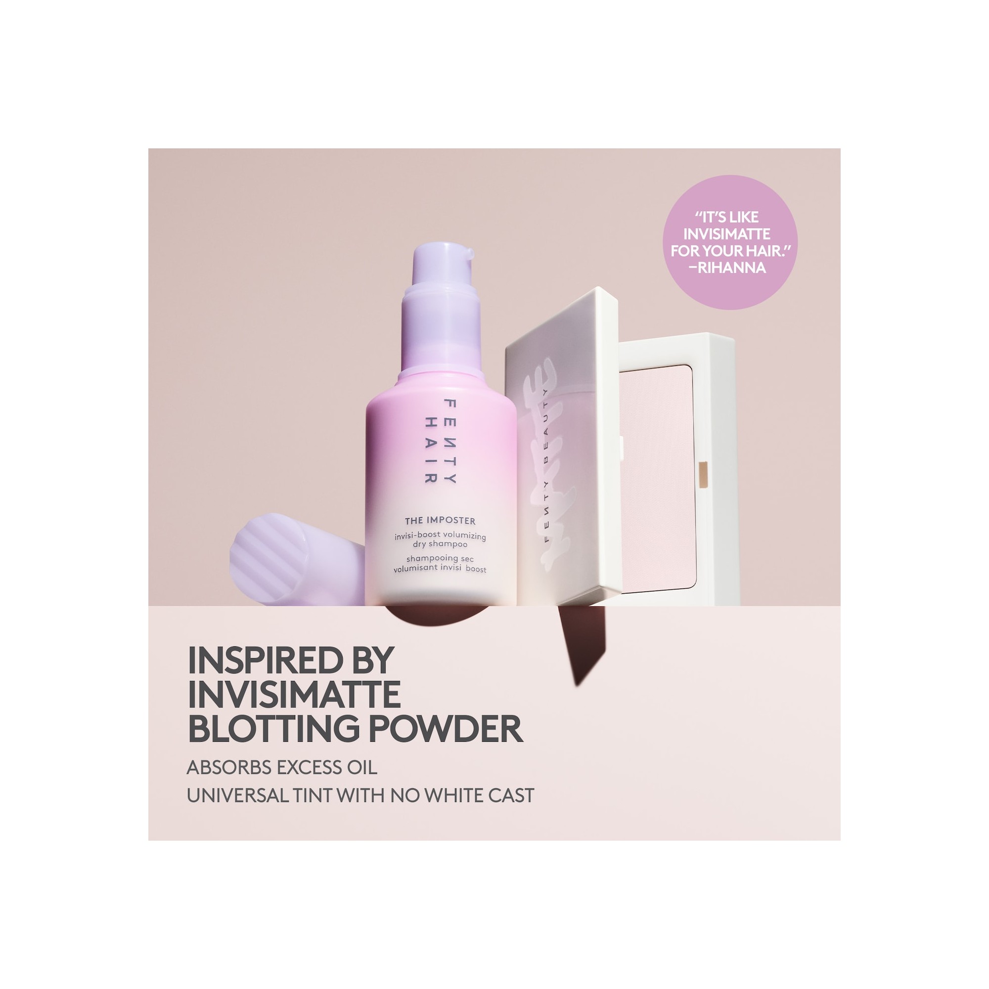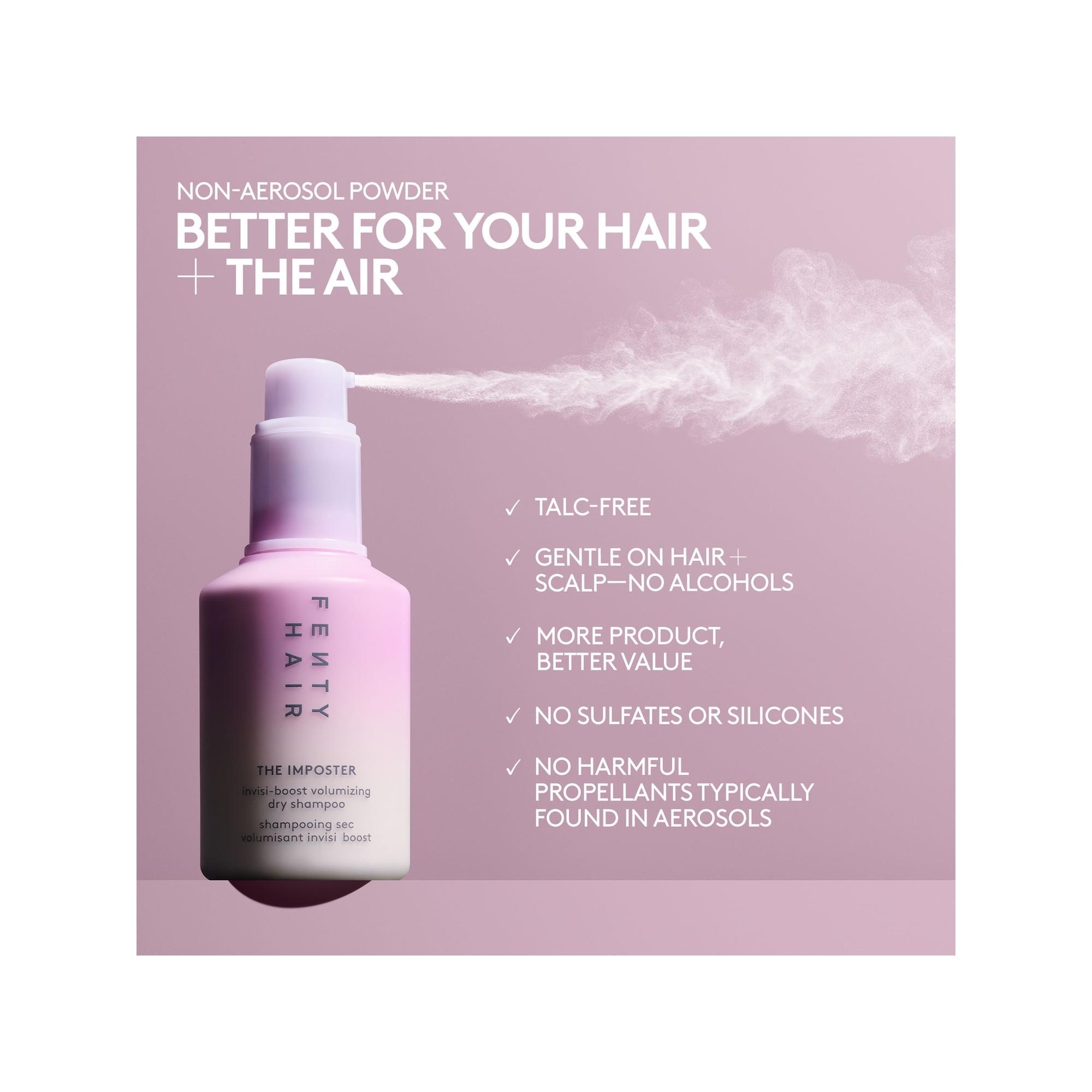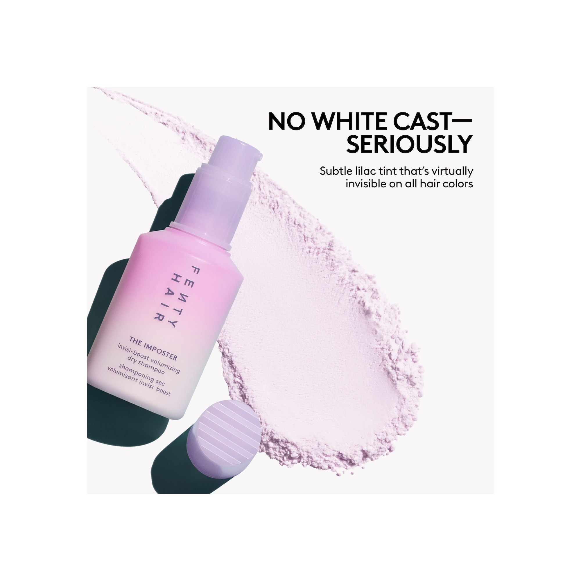 Fenty Hair The Imposter Invisi-Boost Volumizing Dry Shampoo est un shampoing sec qui absorbe l’excès de sébum tout en apportant instantanément du volume et de la texture, sans laisser de résidus blancs. Le Imposter Invisi-Boost Volumizing Dry Shampoo est une formule sans talc et non aérosol, idéale pour espacer les lavages et redonner du pep’s aux cheveux plats. Grâce à sa subtile teinte lilas, il est pratiquement invisible sur tous les types et couleurs de cheveux, tout en absorbant efficacement le sébum et en rafraîchissant les racines en quelques gestes. Inspiré de la poudre Invisimatte Instant Setting and Blotting Powder, ce shampoing sec offre un effet volume dès la racine et une texture naturelle, parfait pour raviver les cheveux du lendemain et des jours suivants sans effet blanchissant. L’amidon de tapioca aide à absorber l’excès de sébum, les impuretés et les résidus, tandis que l’amidon de riz apporte du volume et de la densité. Enrichi en provitamine B5, il aide à apporter de la brillance, et laisse sur les cheveux un parfum signature “amber bouquet”, une fragrance florale chaude et élégante.