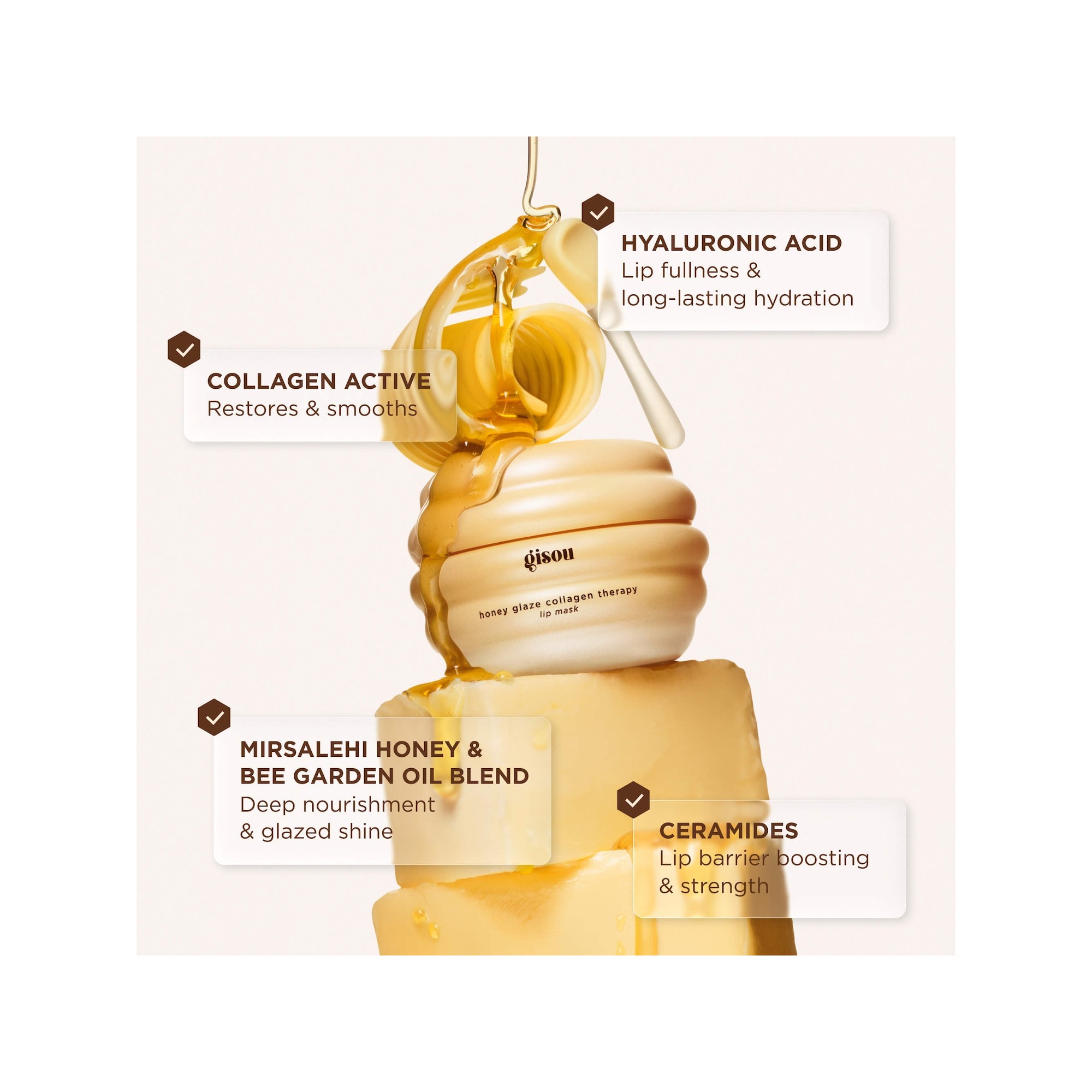 Gisou Honey Glaze Collagen Therapy Lip Mask est un masque pour les lèvres délicieusement parfumé, à la texture beurre, formulé à base de miel de Mirsalehi et de collagène pour une hydratation cliniquement prouvée, un effet apaisant et une brillance effet glaçage. Cette formule réparatrice est enrichie en miel de Mirsalehi, actifs de collagène, céramides et acide hyaluronique afin d’hydrater intensément et de soutenir la barrière des lèvres, révélant des lèvres plus douces et visiblement plus lisses. Associée à une texture fondante et à un irrésistible parfum de honey buttercream, elle agit comme une véritable thérapie instantanée pour les lèvres. Le miel de Mirsalehi et le mélange d’huiles Bee Garden apportent une nutrition profonde et une brillance effet miroir, tandis que les actifs de collagène restaurent et lissent les lèvres. L’acide hyaluronique contribue à repulper les lèvres et à offrir une hydratation longue durée. Moelleux, enveloppant et enrichi du parfum chaud et divin du miel de Mirsalehi, le masque pour les lèvres Gisou Honey Glaze Collagen Therapy Lip Mask chouchoute les lèvres avec intensité. Formulé à partir de miel frais récolté dans le propre jardin d’abeilles Mirsalehi de la marque, ce soin riche et indulgent fond sur les lèvres comme du beurre, restaurant une douceur veloutée, une brillance effet verre et une hydratation profonde. Grâce à des actifs dérivés du collagène pour un effet repulpant, des céramides pour renforcer la barrière cutanée et de l’acide hyaluronique pour une hydratation durable, il transforme le soin quotidien des lèvres en un rituel sensoriel luxueux de nutrition et de réparation au miel.