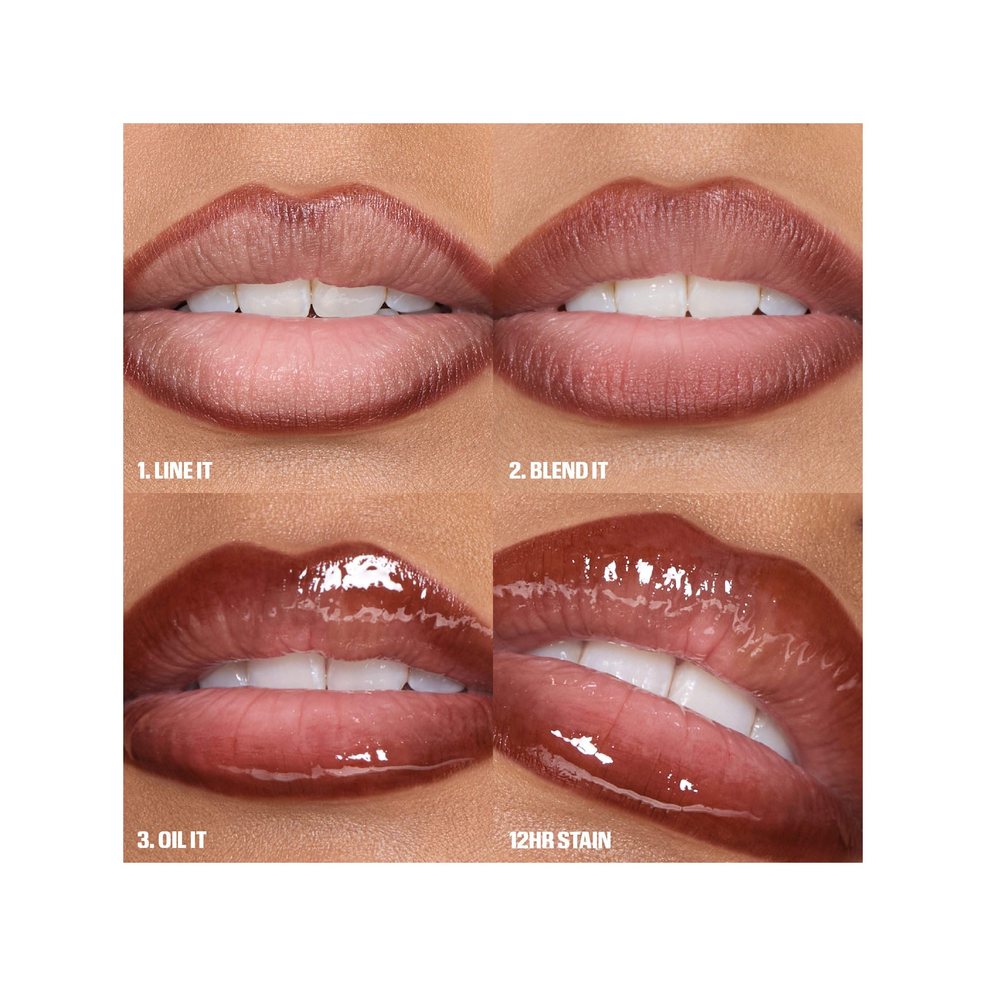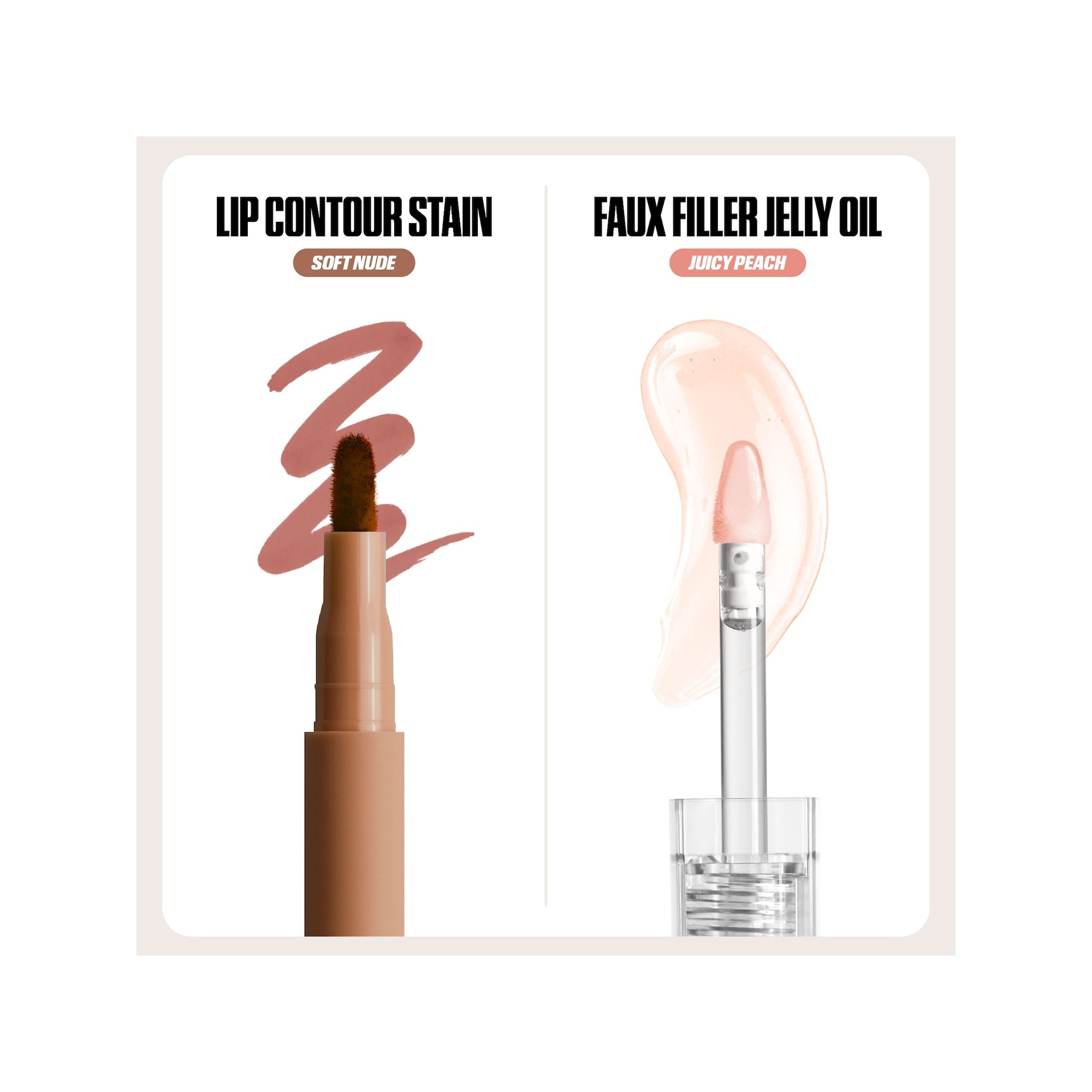 Huda Beauty Makeout Sesh Lip Duo Peachy Nudes est un coffret pour les lèvres en édition limitée incontournable, composé du Lip Contour Stain et du Faux Filler Jelly Oil, pour des lèvres joliment teintées d’un effet « jelly » qui ne bouge pas. Le Lip Contour Stain en teinte Soft Nude est un hybride entre un crayon et une encre à lèvres longue tenue, offrant jusqu’à 12 heures de résistance au transfert. Son double applicateur permet de redessiner les lèvres avec précision et facilité. Hautement pigmentée et enrichie en huile d’argan hydratante, sa formule offre une couleur mate naturelle, sans bavure. Le Faux Filler Jelly Oil est une huile teintée et parfumée pour les lèvres, ultra hydratante et adoucissante, formulée avec des peptides et du beurre de karité pour un fini brillant, juteux et non collant. Avec le Faux Filler Lip Gloss, chaque application apporte éclat, confort et nutrition grâce à la vitamine E et au collagène végétalien, pour des lèvres lisses, souples et repulpées. Découvrez le Makeout Sesh Lip Kit de Huda Beauty, un duo irrésistible qui allie couleur intense et hydratation, tout en offrant une économie de 27 %. Ce coffret associe l’encre à lèvres best-seller, au fini impeccable, à un gloss ultra-brillant pour un résultat flatteur et soigné. Grâce à sa combinaison d’ingrédients nourrissants, ce kit sublime la douceur et la plénitude des lèvres pour une bouche plus belle que jamais.