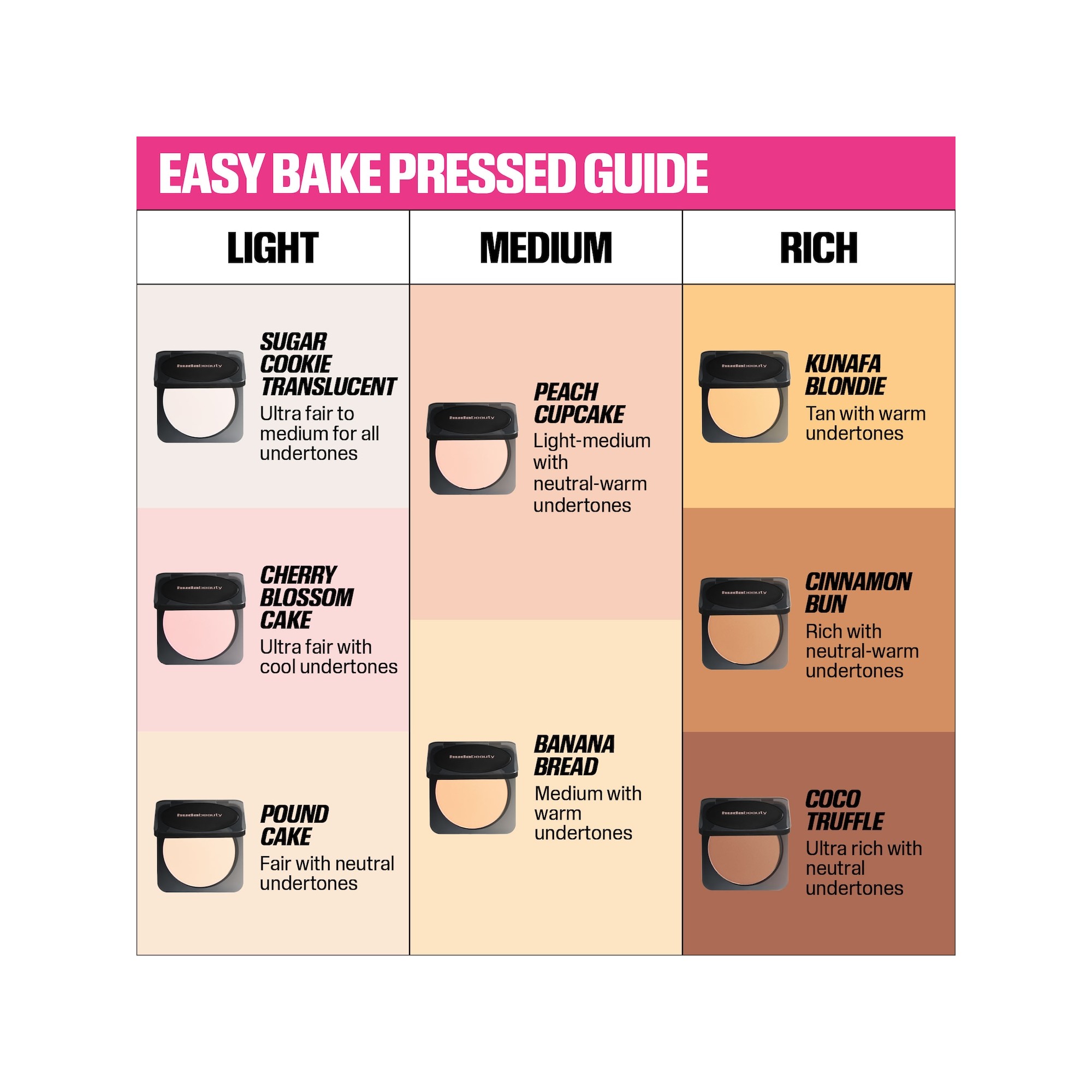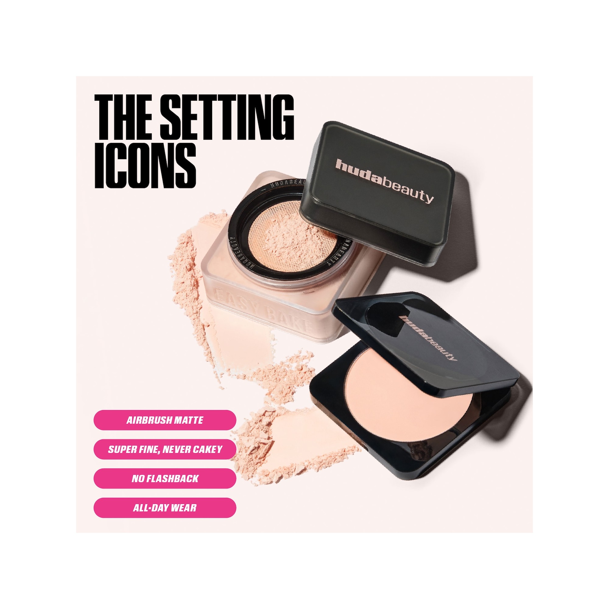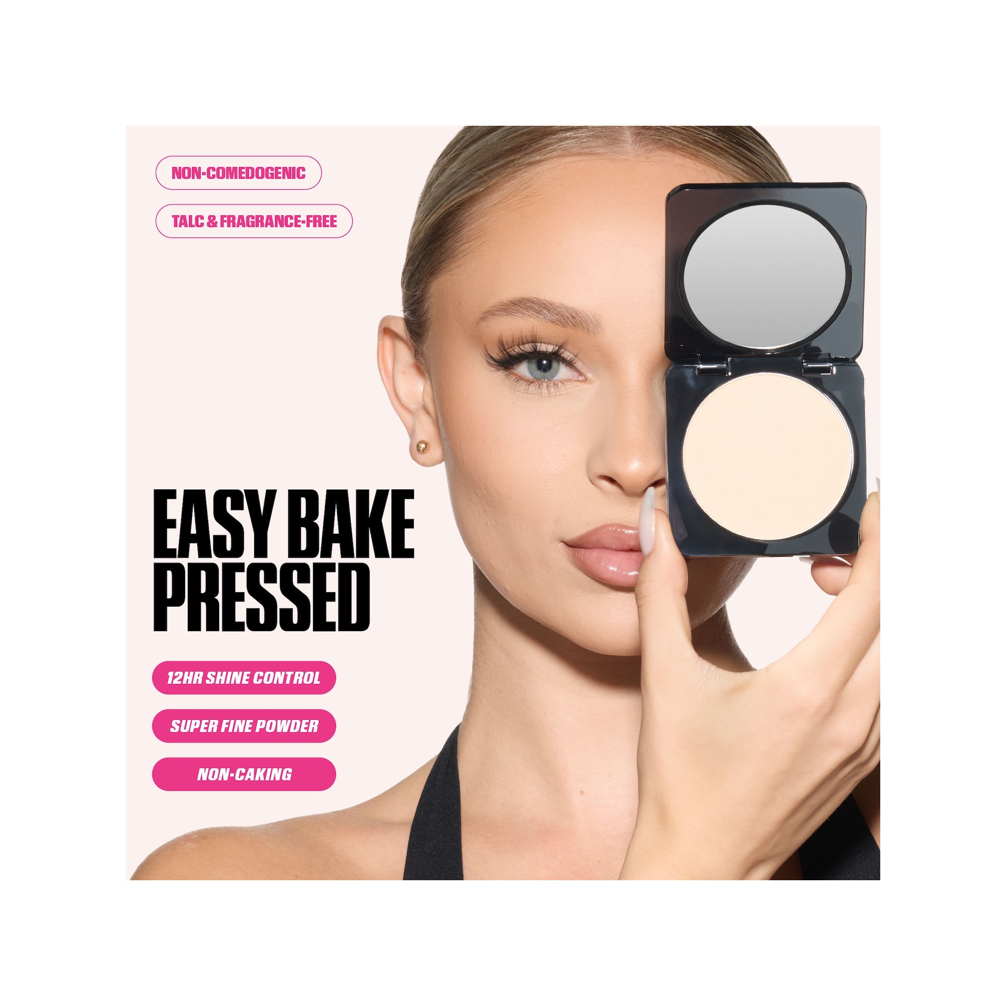 Huda Beauty Easy Bake Airbrush Matte Pressed Setting Powder est une poudre compacte non comédogène, ultra-fine, sans talc ni parfum, offrant jusqu’à douze heures de contrôle de la brillance pour un fini mat effet airbrush, sans effet plâtre. Airbrush Made Easy avec l’iconique Easy Bake de Huda Beauty, désormais en version compacte. Cette poudre pressée ultra-fine, longue tenue et jamais cakey, floute, lisse et fixe le maquillage pour un fini mat effet airbrush jusqu’à 12 heures. Élégante, compacte et facile à transporter, elle est idéale à glisser dans son sac pour appliquer ou rafraîchir le maquillage en cours de journée. À utiliser avec la Easy Bake Marshmallow Sponge & Puff de Huda Beauty (vendue séparément) pour des retouches faciles, à tout moment et en tout lieu. Formulée avec de l’amidon de riz pour absorber l’excès de sébum et des poudres micronisées permettant de superposer sans alourdir. Pratique et nomade, fixez votre teint où que vous soyez avec la Easy Bake Pressed Powder de Huda Beauty, un indispensable de la trousse beauté pour flouter et matifier la peau. Version compacte de la poudre libre iconique que l’on connaît et adore, cette formule légère dépose un voile velouté sur la peau tout en contrôlant l’excès de brillance. Enrichie en amidon de riz et en mica ultra-fin, cette poudre douce comme un pétale fixe le maquillage pour un fini lisse et parfaitement homogène.