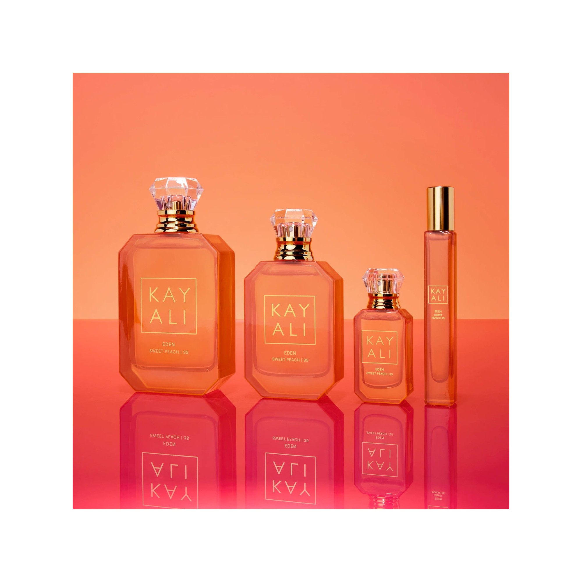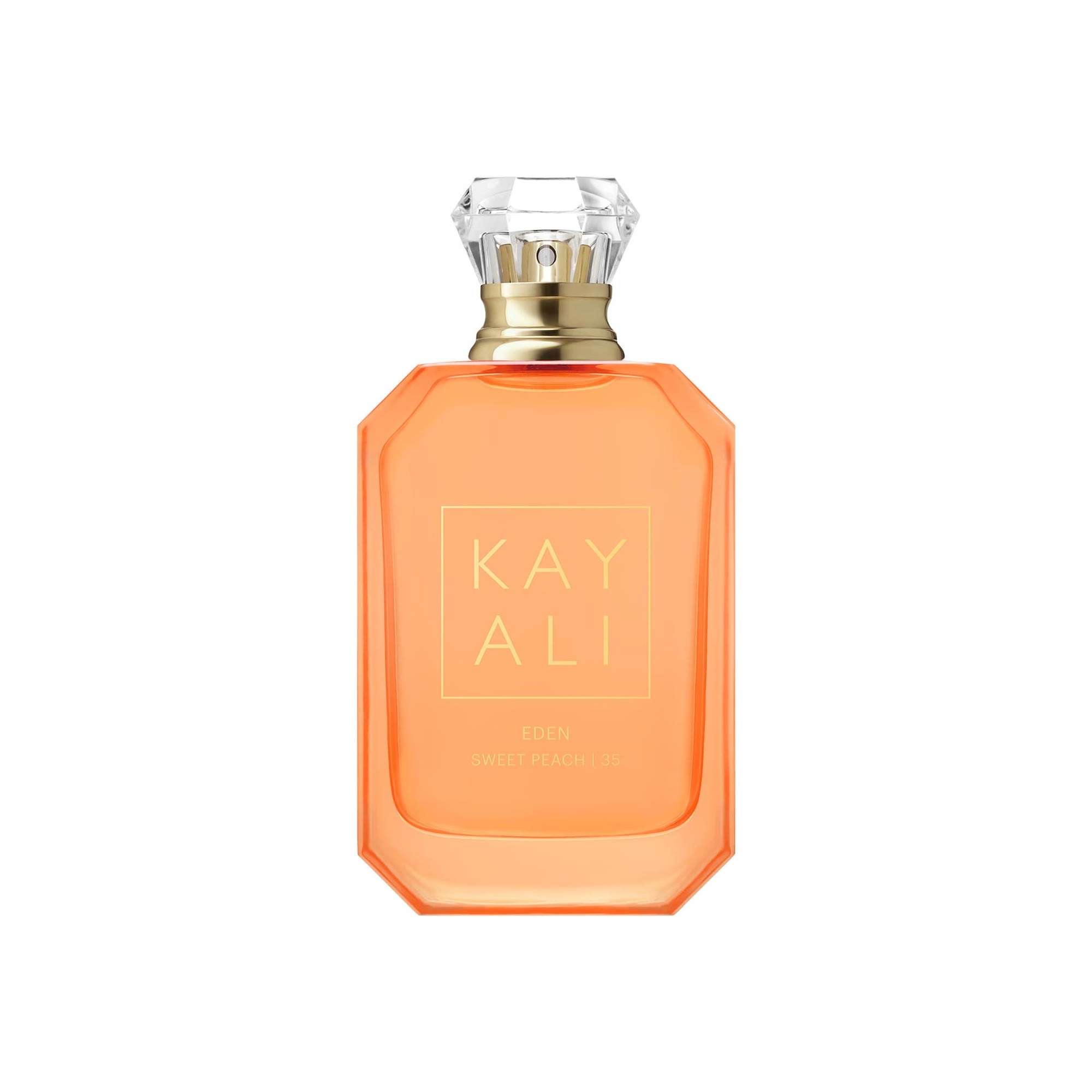 Eden Sweet Peach | 35 se présente dans un flacon laqué couleur pêche, à l'image de la nature radieuse et généreuse du parfum qu'il renferme. Les flacons et cabochons iconiques de KAYALI évoquent le diamant et sont inspirés des flacons d'oud traditionnels du Moyen-Orient. Le numéro 35 indique le nombre de formulations nécessaires pour obtenir le parfum idéal.