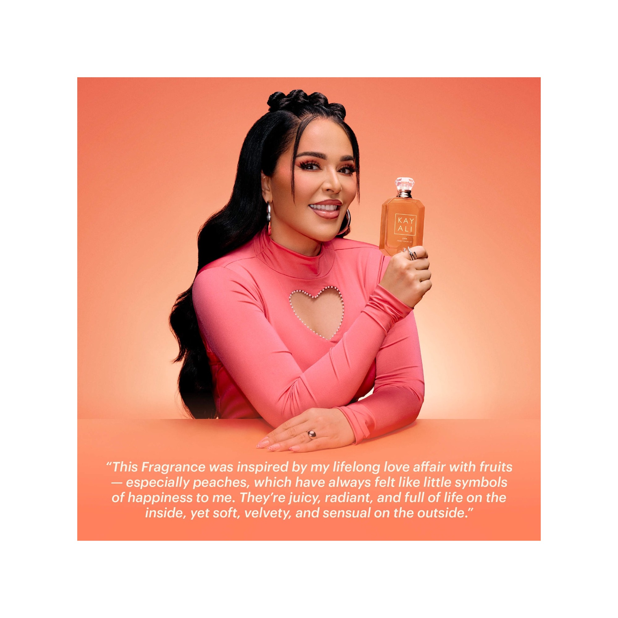Kayali Eden Sweet Peach | 35 Eau de Parfum est un parfum doux, gourmand et velouté dans un flacon de bonheur à l'état pur. Dès la première vaporisation, la pêche sucrée-acidulée et la pomme rouge croquante composent une ouverture lumineuse et alléchante, tandis que le frangipanier crémeux instille douceur et chaleur au cœur. À mesure que le parfum se développe sur la peau, un musc enveloppant s'y fond délicatement, laissant un sillage tendre et irrésistible qui irradie d'une joie toute naturelle. « Eden Sweet Peach | 35 est né de mon amour de toujours pour les fruits, et tout particulièrement pour les pêches de petits symboles de bonheur qui m'ont toujours accompagnée. Ayant grandi dans le Tennessee, les pêches faisaient partie intégrante de la vie sudiste : dans les tartes, le thé glacé, et tant d'instants du quotidien qui les ont rendues si chères à ma mémoire. Juteuses, rayonnantes et pleines de vie en surface, douces, veloutées et sensuelles sous la peau cette belle dualité me ressemble profondément : audacieuse et lumineuse, mais toujours tendre et chaleureuse au fond. Je voulais que ce parfum capture cette énergie… cette façon d'éclore avec une douceur espiègle avant de se fondre en un sillage onctueux et crémeux qui vous enveloppe comme une étreinte. Enivrant, irrésistible, il est impossible de ne pas sourire en le portant tout comme les plus beaux instants de la vie ! » Mona Kattan