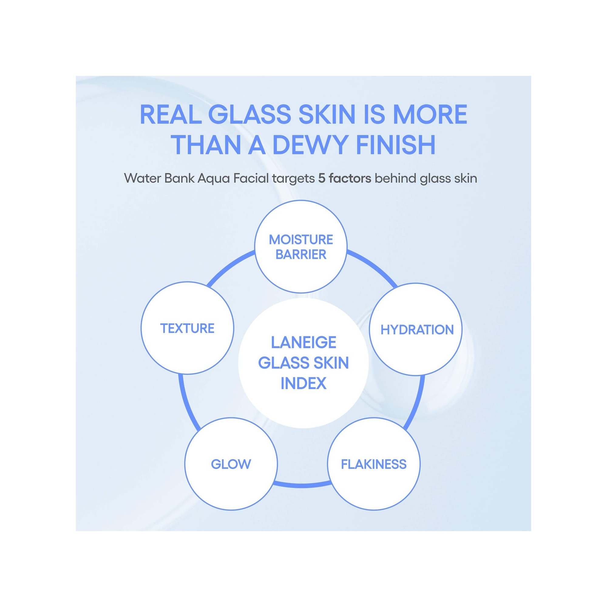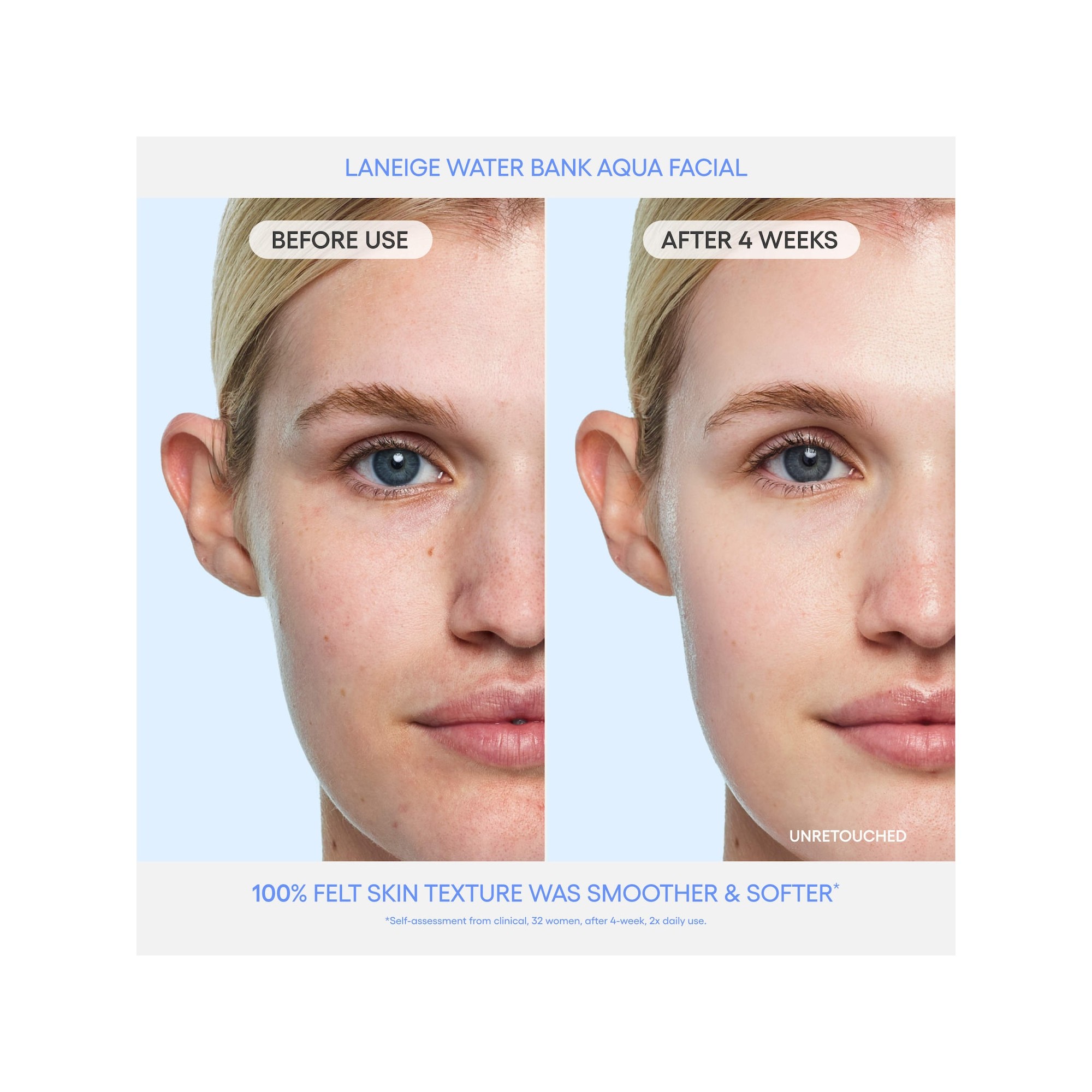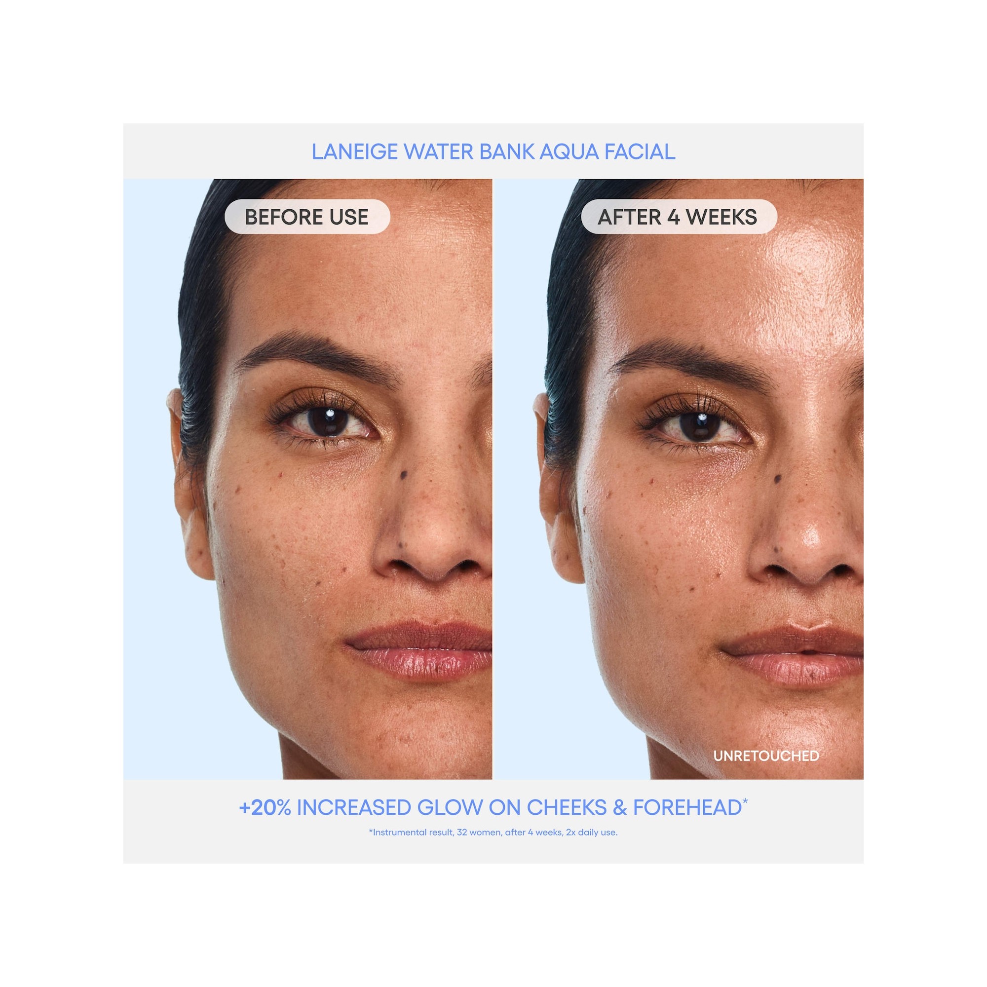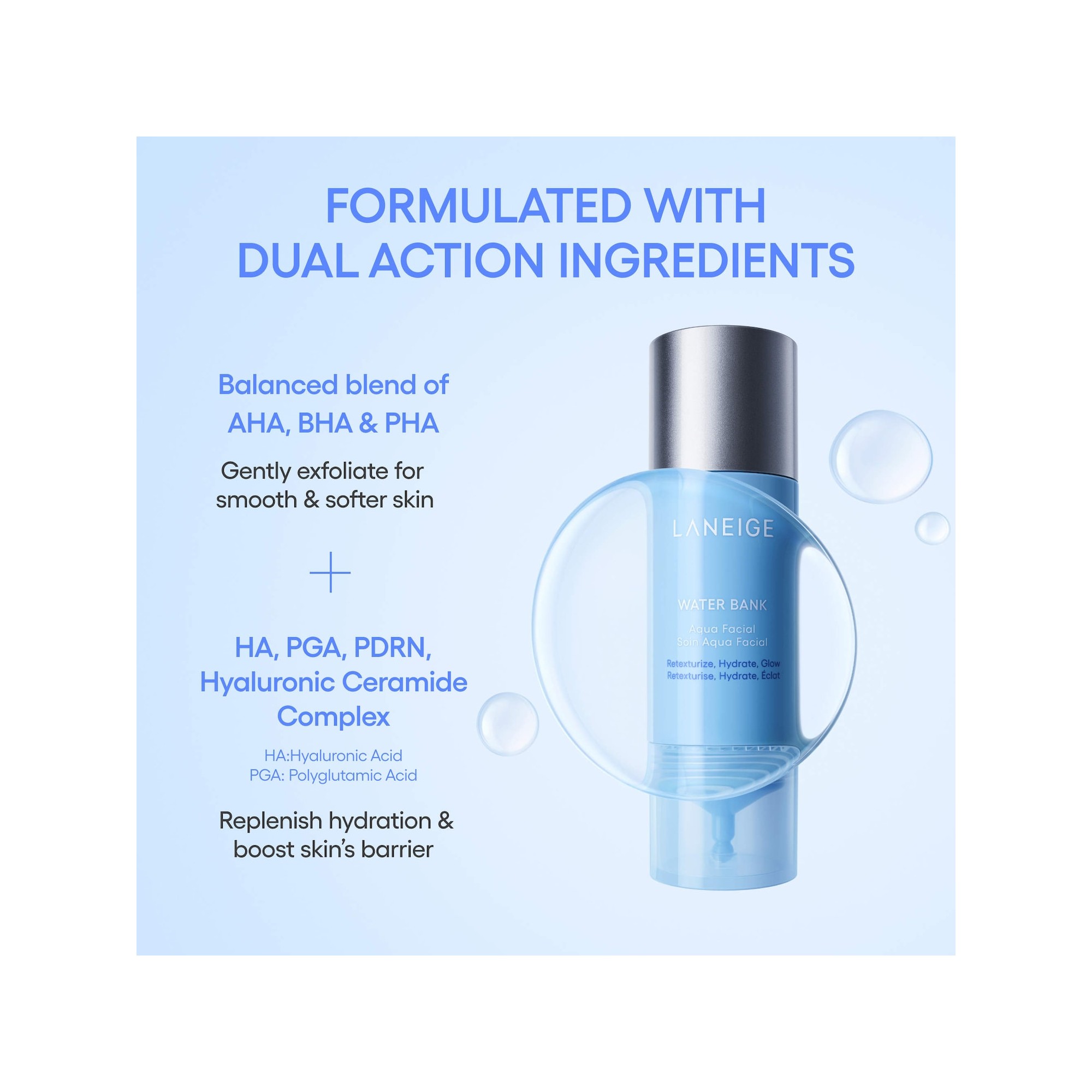 Laneige Water Bank Aqua Facial Serum BHA + AHA - Gently Exfoliate, Hydrate & Glow est un sérum quotidien inspiré des soins du visage coréens « glass skin » qui exfolie en douceur, hydrate et booste l’éclat. Ce sérum tout-en-un est formulé avec une action double associant des AHA, BHA et PHA pour exfolier délicatement, lisser et adoucir la peau, tandis que l’acide hyaluronique, l’acide polyglutamique, le PDRN et le complexe céramide à l’acide hyaluronique apportent une hydratation intense pour un éclat post-soin en un seul geste. Un complexe d’acides à 7,7 % avec AHA, BHA et PHA exfolie en douceur, lisse et adoucit la peau, tandis qu’un Hydro Infusion Shot formulé avec de l’acide hyaluronique, de l’acide polyglutamique, du PDRN et un complexe céramide à l’acide hyaluronique recharge l’hydratation et soutient la barrière cutanée. Revigorez le teint avec Laneige Water Bank Glass Facial, un sérum retexturisant et hydratant formulé pour révéler un fini lumineux de peau de verre. Doté de l'Aqua Glass Shot avec un complexe acide de 7,7 % d'AHA, BHA et PHA, il exfolie et purifie les pores en douceur tout en lissant les irrégularités de la texture pour une apparence visiblement plus claire et plus équilibrée. La technologie Hydro Infusion™ associe l'acide hyaluronique réticulé, le PGA, le PDRN et le céramide hyaluronique pour offrir une hydratation durable et favoriser une sensation de souplesse. Enrichi en niacinamide et en antioxydants, ce sérum hydratant pour le visage permet d'équilibrer, d'éclaircir et de laisser la peau avec un aspect radieux et clarifié. Laneige Water Bank Glass Facial est conçu pour offrir une hydratation quotidienne et une texture raffinée avec un éclat naturel et sain. Il convient à tous les types de peau.