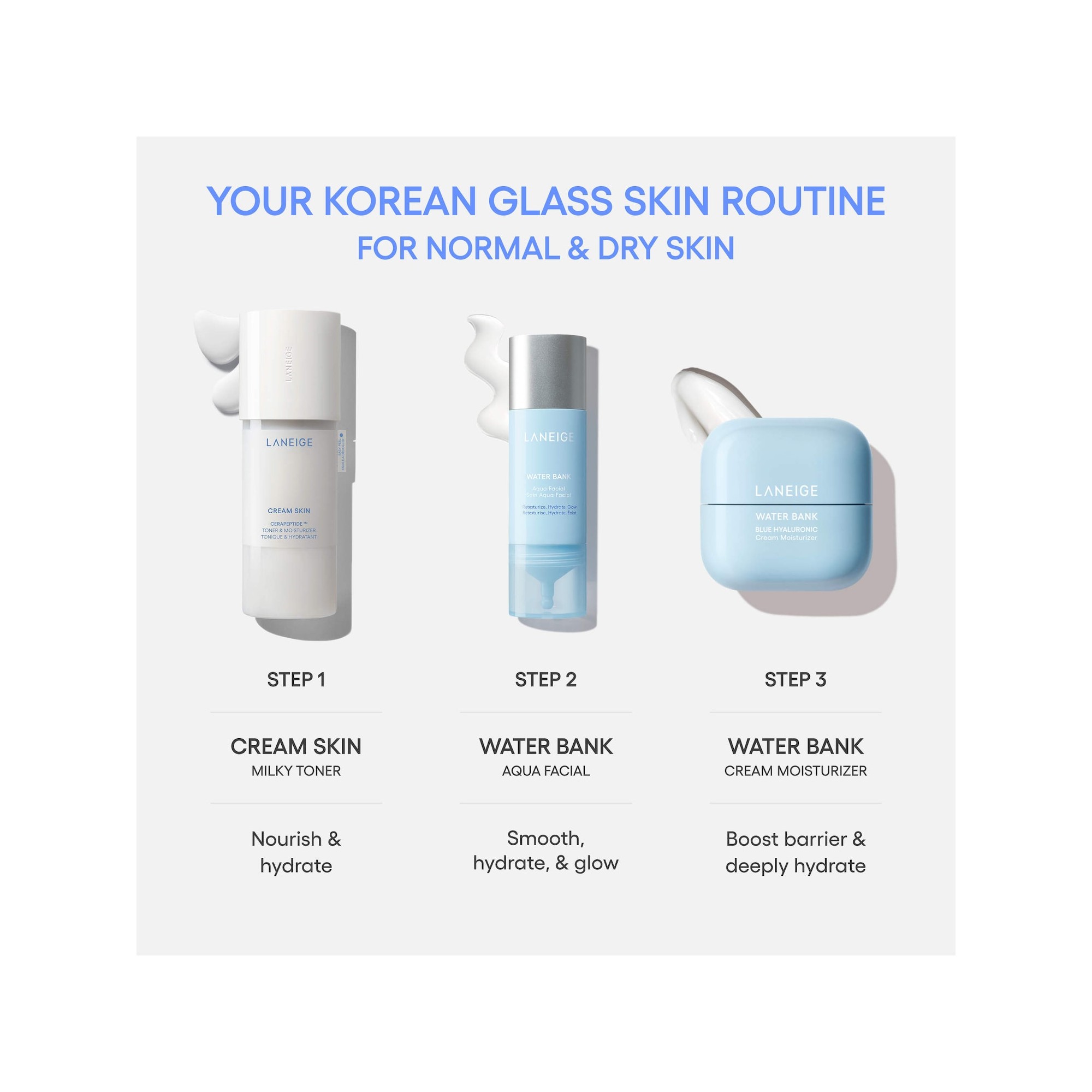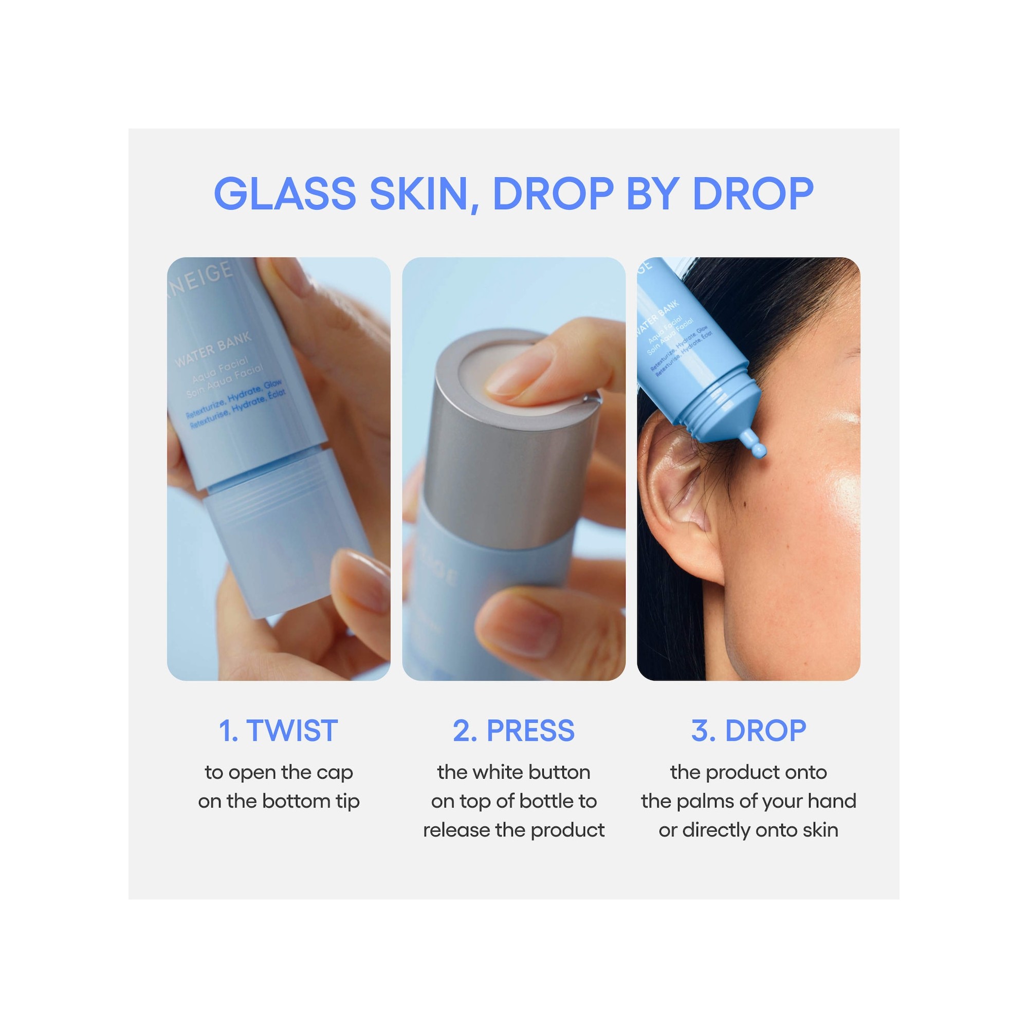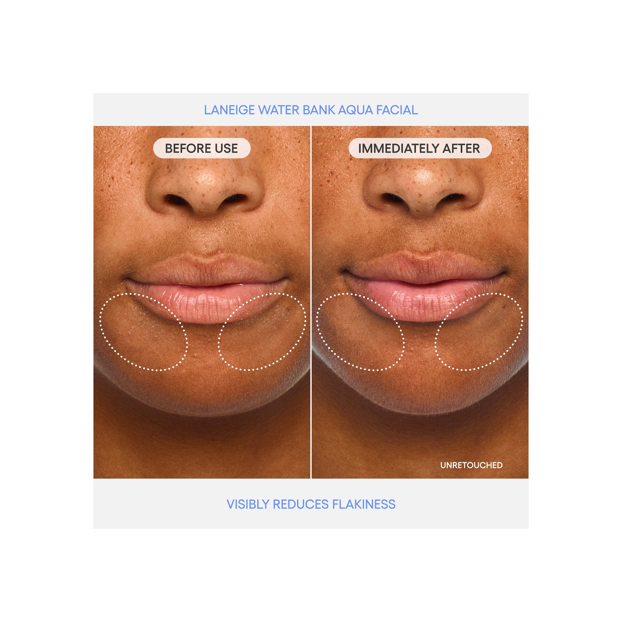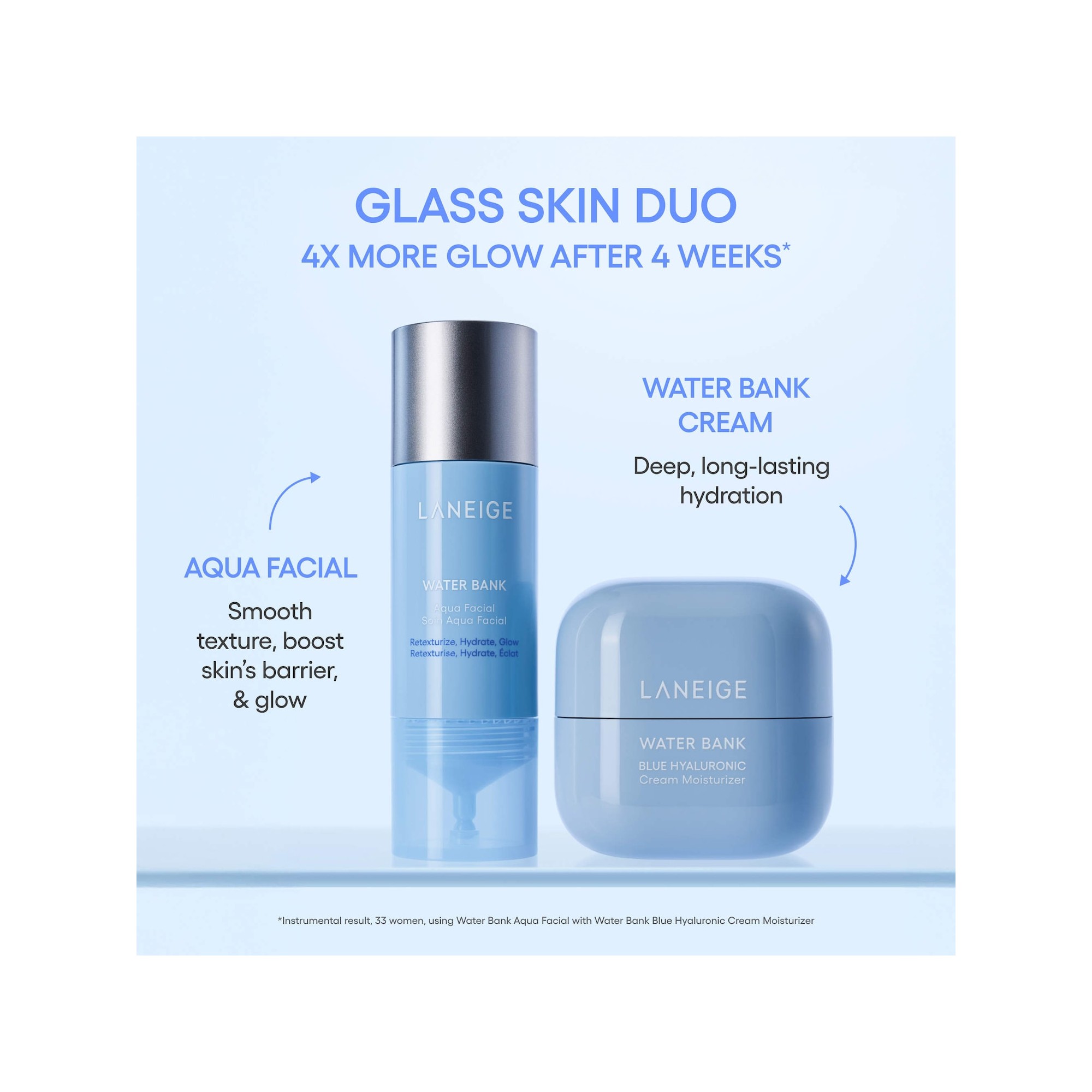 Laneige Water Bank Aqua Facial Serum BHA + AHA - Gently Exfoliate, Hydrate & Glow est un sérum quotidien inspiré des soins du visage coréens « glass skin » qui exfolie en douceur, hydrate et booste l’éclat. Ce sérum tout-en-un est formulé avec une action double associant des AHA, BHA et PHA pour exfolier délicatement, lisser et adoucir la peau, tandis que l’acide hyaluronique, l’acide polyglutamique, le PDRN et le complexe céramide à l’acide hyaluronique apportent une hydratation intense pour un éclat post-soin en un seul geste. Un complexe d’acides à 7,7 % avec AHA, BHA et PHA exfolie en douceur, lisse et adoucit la peau, tandis qu’un Hydro Infusion Shot formulé avec de l’acide hyaluronique, de l’acide polyglutamique, du PDRN et un complexe céramide à l’acide hyaluronique recharge l’hydratation et soutient la barrière cutanée. Revigorez le teint avec Laneige Water Bank Glass Facial, un sérum retexturisant et hydratant formulé pour révéler un fini lumineux de peau de verre. Doté de l'Aqua Glass Shot avec un complexe acide de 7,7 % d'AHA, BHA et PHA, il exfolie et purifie les pores en douceur tout en lissant les irrégularités de la texture pour une apparence visiblement plus claire et plus équilibrée. La technologie Hydro Infusion™ associe l'acide hyaluronique réticulé, le PGA, le PDRN et le céramide hyaluronique pour offrir une hydratation durable et favoriser une sensation de souplesse. Enrichi en niacinamide et en antioxydants, ce sérum hydratant pour le visage permet d'équilibrer, d'éclaircir et de laisser la peau avec un aspect radieux et clarifié. Laneige Water Bank Glass Facial est conçu pour offrir une hydratation quotidienne et une texture raffinée avec un éclat naturel et sain. Il convient à tous les types de peau.