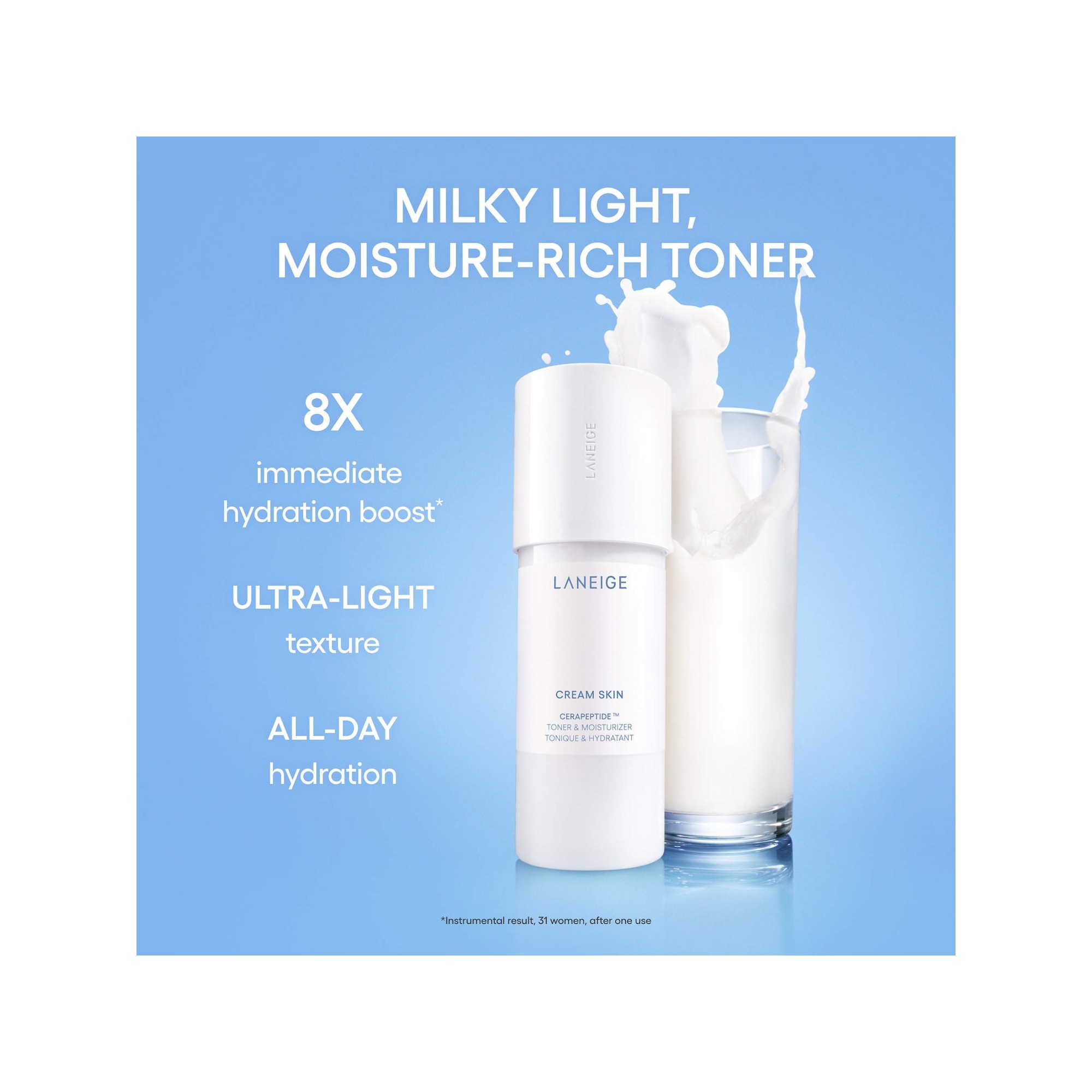 Laneige Daily Hydration Minis Essential Set est une routine de soin composée d'un nettoyant doux, une brume tonique lactée apaisante et une crème intensément hydratante réunis dans un kit, pratique pour le voyage, pour hydrater la peau et raviver l’éclat en trois étapes simples. Retrouvez tous vos essentiels glow en format miniature dans un seul coffret comprenant un nettoyant, un tonique et un soin hydratant. Le Water Bank Gentle Gel Cleanser nettoie délicatement la peau sans l’assécher ni altérer son équilibre naturel. La Cream Skin Milky Toner Mist nourrit et hydrate instantanément, tout en apportant confort et souplesse. La Water Bank Cream Moisturizer offre une hydratation durable et revitalisante pour une peau repulpée et lumineuse. L’allantoïne contenue dans le Water Bank Gentle Gel Cleanser aide à maintenir une sensation d’hydratation après le nettoyage. Le complexe de céramides et de peptides de la Cream Skin Milky Toner renforce la barrière cutanée tout en apportant une nutrition intense. Enfin, l’acide hyaluronique bleu présent dans la Water Bank Cream Moisturizer assure une hydratation efficace et longue durée pour une peau visiblement plus saine et éclatante.