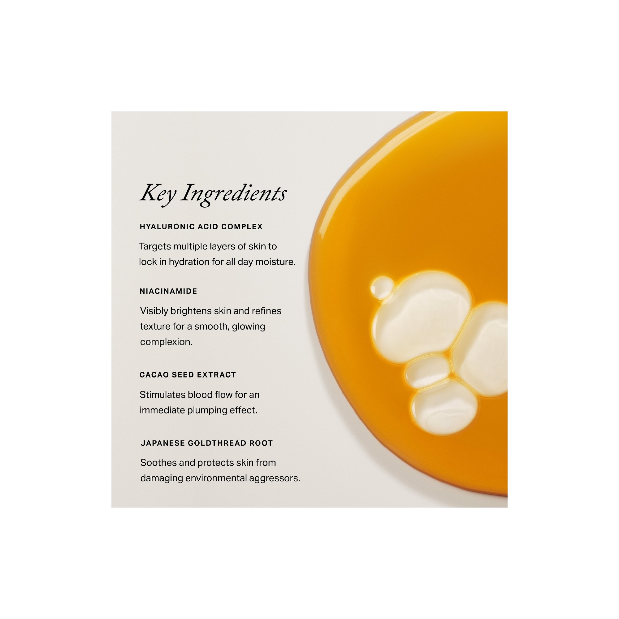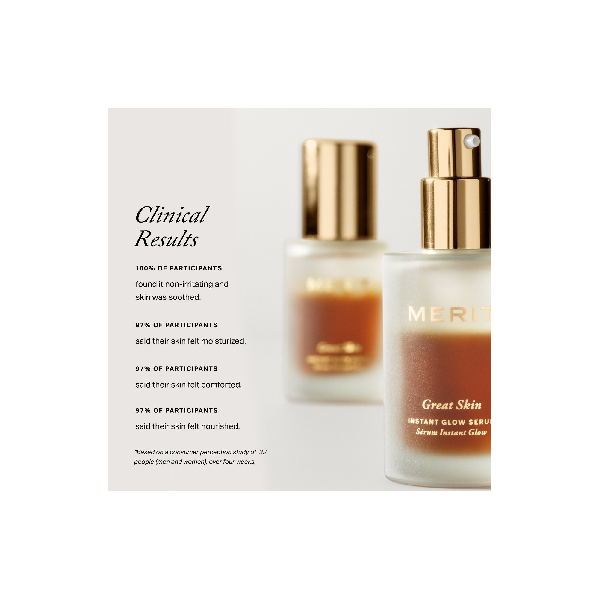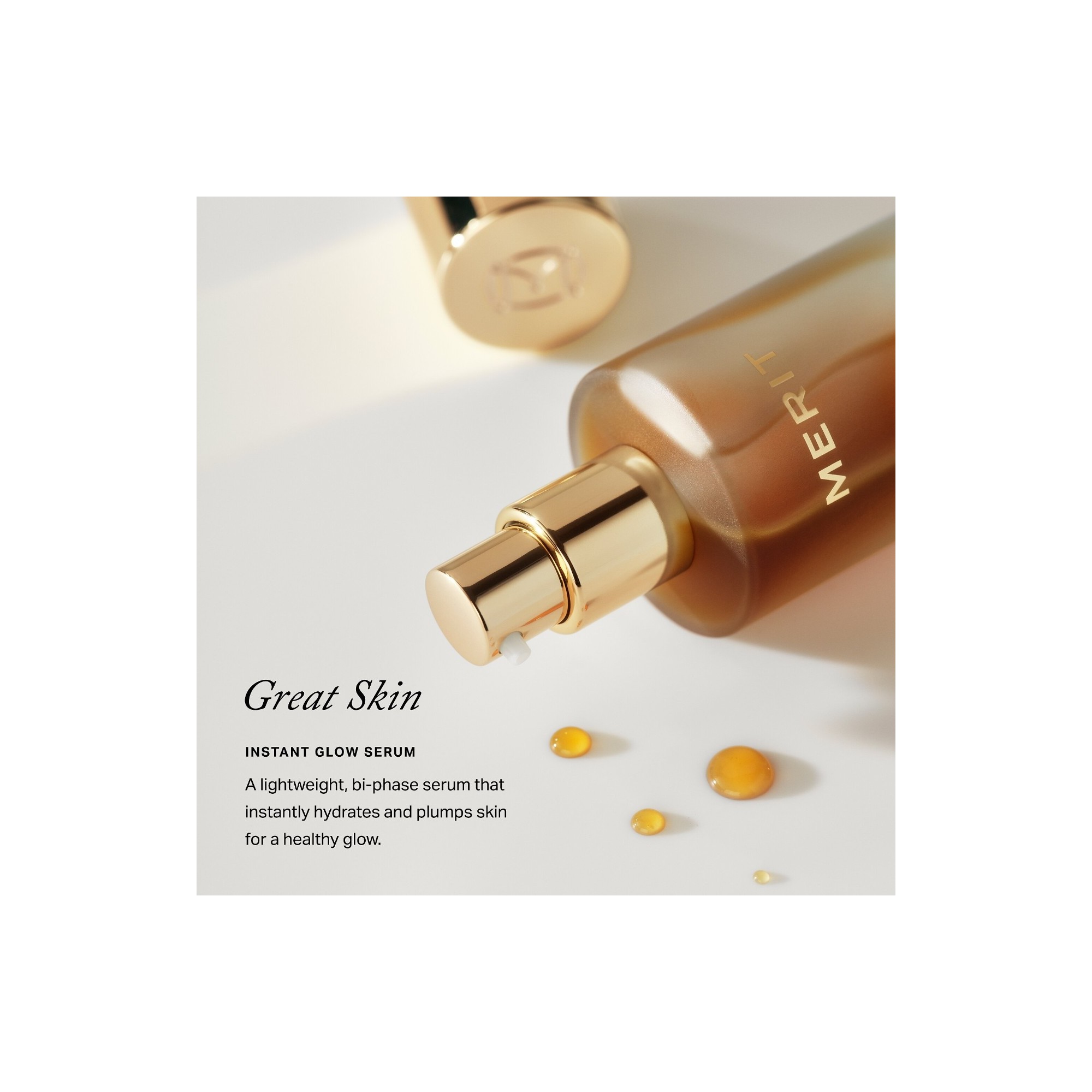 Merit Great Skin Instant Glow Serum with Niacinamide and Hyaluronic Acid est un sérum biphasé léger qui hydrate rapidement la peau et la repulpe visiblement, tout en la laissant plus calme, plus lumineuse et plus uniforme. Sa formule non comédogène et ultra légère pénètre rapidement sans laisser de résidu, laissant la peau visiblement plus rebondie, hydratée et parfaitement préparée au maquillage. Il est conçu pour être utilisé avec The Minimalist (vendu séparément), mais peut aussi s’utiliser avec n’importe quel produit teint ou seul pour donner à la peau un éclat naturel et sain. Le complexe d’acide hyaluronique agit à plusieurs niveaux de la peau pour retenir l’hydratation tout au long de la journée. La niacinamide aide à illuminer le teint et à affiner le grain de peau pour un résultat plus lisse et éclatant, tandis que l’extrait de fève de cacao, riche en caféine et en antioxydants, stimule la circulation pour un effet repulpé visible.