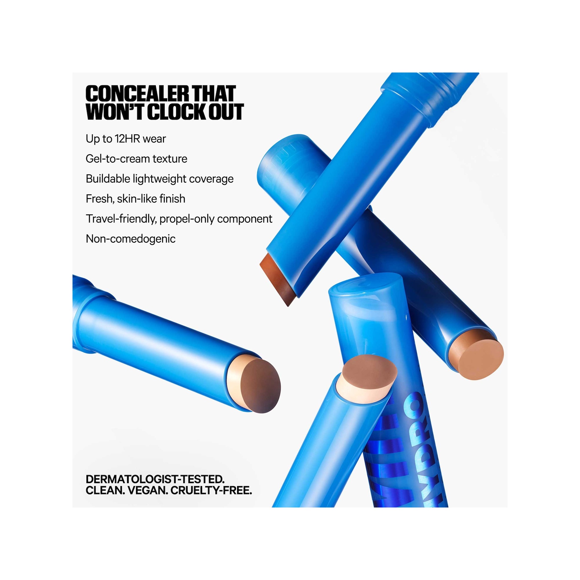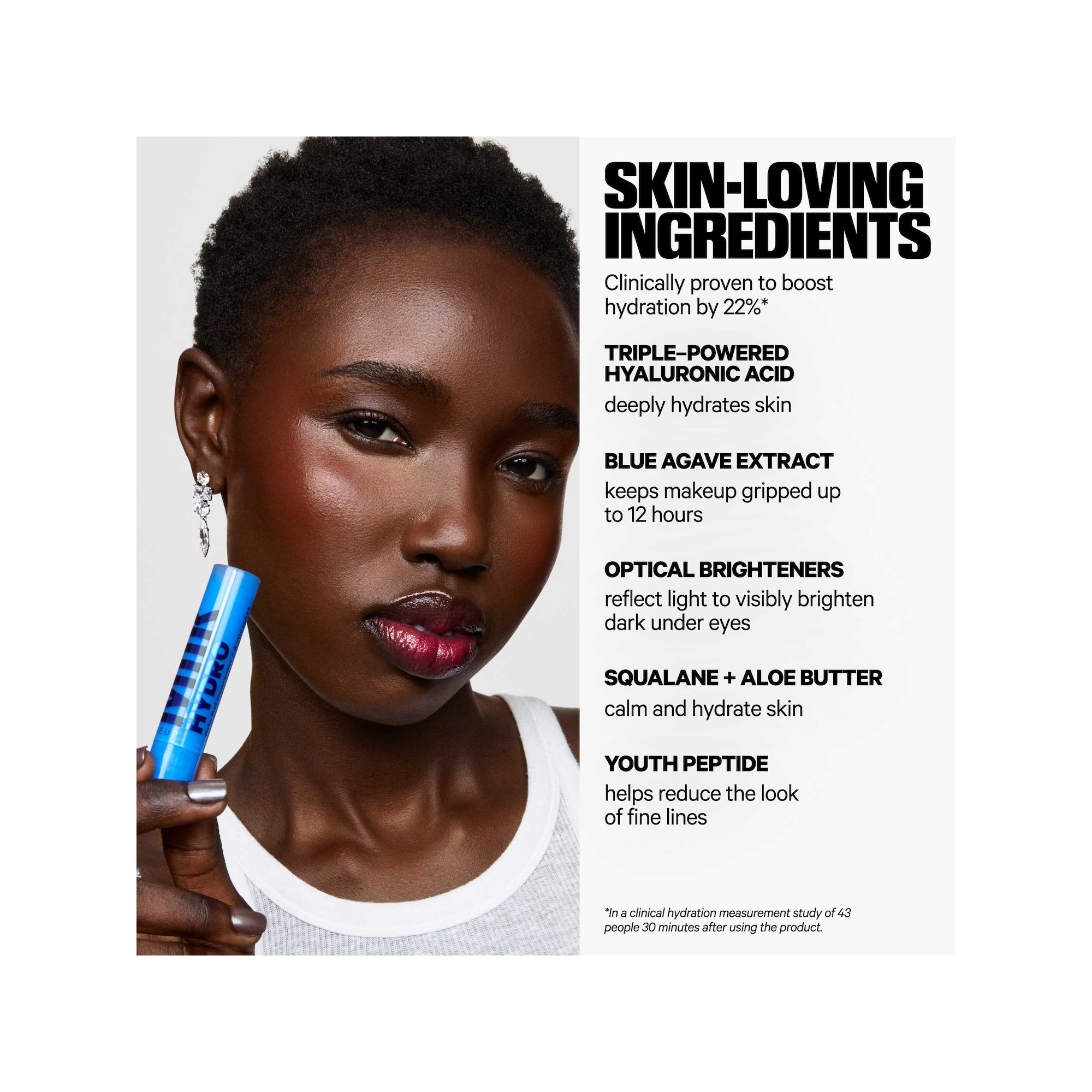Milk Makeup Hydro Grip 12HR Hydrating Gel Stick Concealer est un correcteur clean, non comédogène, en stick gel-crème hydratant 12 heures, à couvrance modulable, qui camoufle rougeurs, cernes et imperfections tout en offrant un fini naturellement lumineux. Ce stick correcteur multi-usage couvre les cernes, boutons, rougeurs, taches pigmentaires et unifie le teint pour un résultat frais et naturel. Enrichi en acide hyaluronique hydratant et en complexe renforçant la barrière cutanée, il est cliniquement prouvé qu’il augmente l’hydratation de la peau de 22 %. Testé sous contrôle dermatologique, il convient aux peaux sensibles. Son complexe d’acide hyaluronique triple action, composé de trois poids moléculaires, hydrate intensément et aide à renforcer la barrière cutanée. Le Skin Barrier Strengthening Complex nourrit et protège la peau, tandis que l’extrait d’agave bleu améliore l’adhérence du maquillage jusqu’à 12 heures, limitant les transferts, les plis et la perte de tenue. Un stick correcteur gel-crème clean et non comédogène, à la couvrance modulable, qui camoufle cernes, rougeurs et imperfections pour un fini naturellement éclatant. Ce correcteur en stick cible efficacement les cernes, imperfections, rougeurs, l'hyperpigmentation et unifie le teint. Sa formule enrichie en acide hyaluronique et en complexe protecteur augmente l'hydratation de la peau pour un résultat beauté et soin. Testé dermatologiquement. Convient aux peaux sensibles.