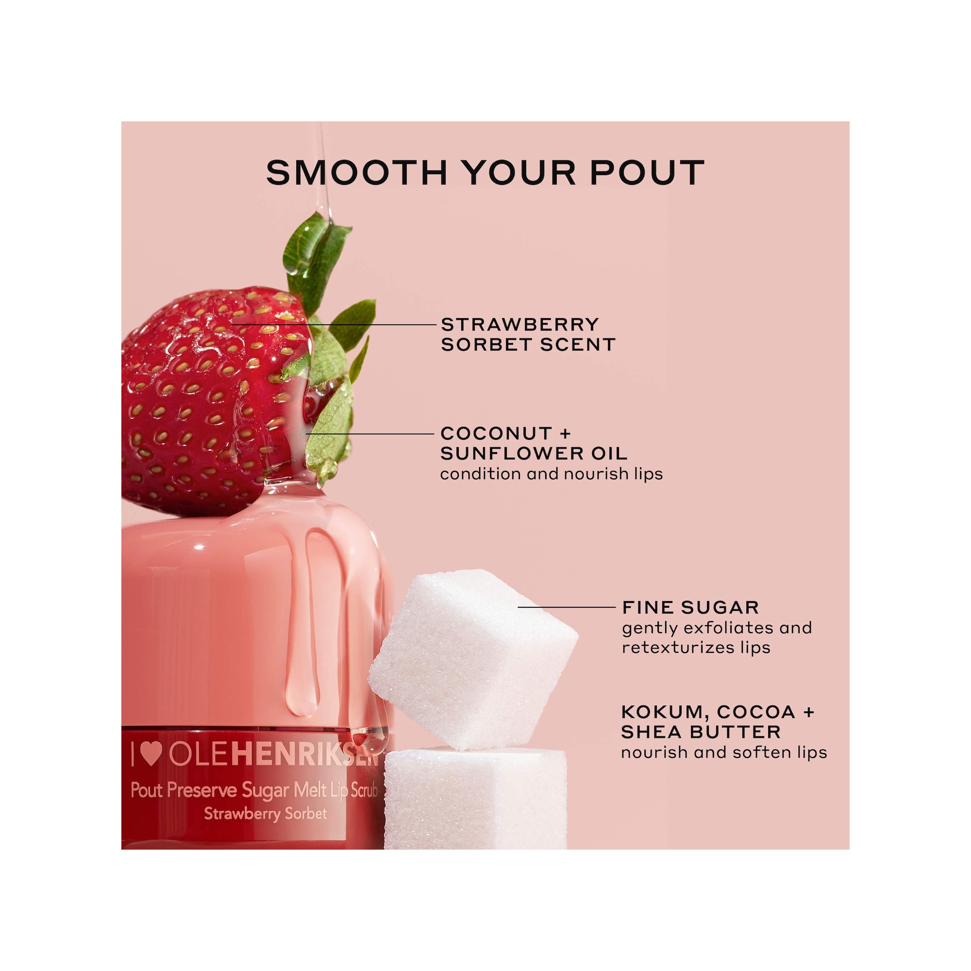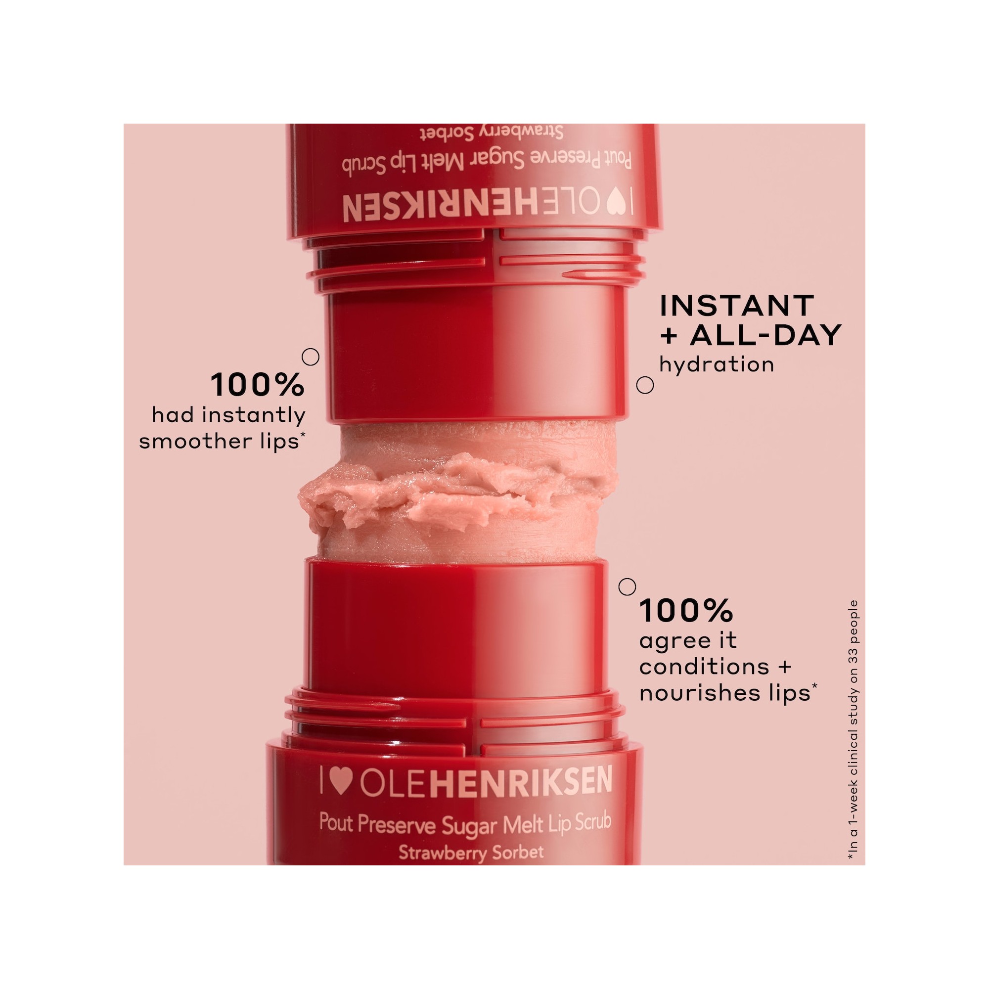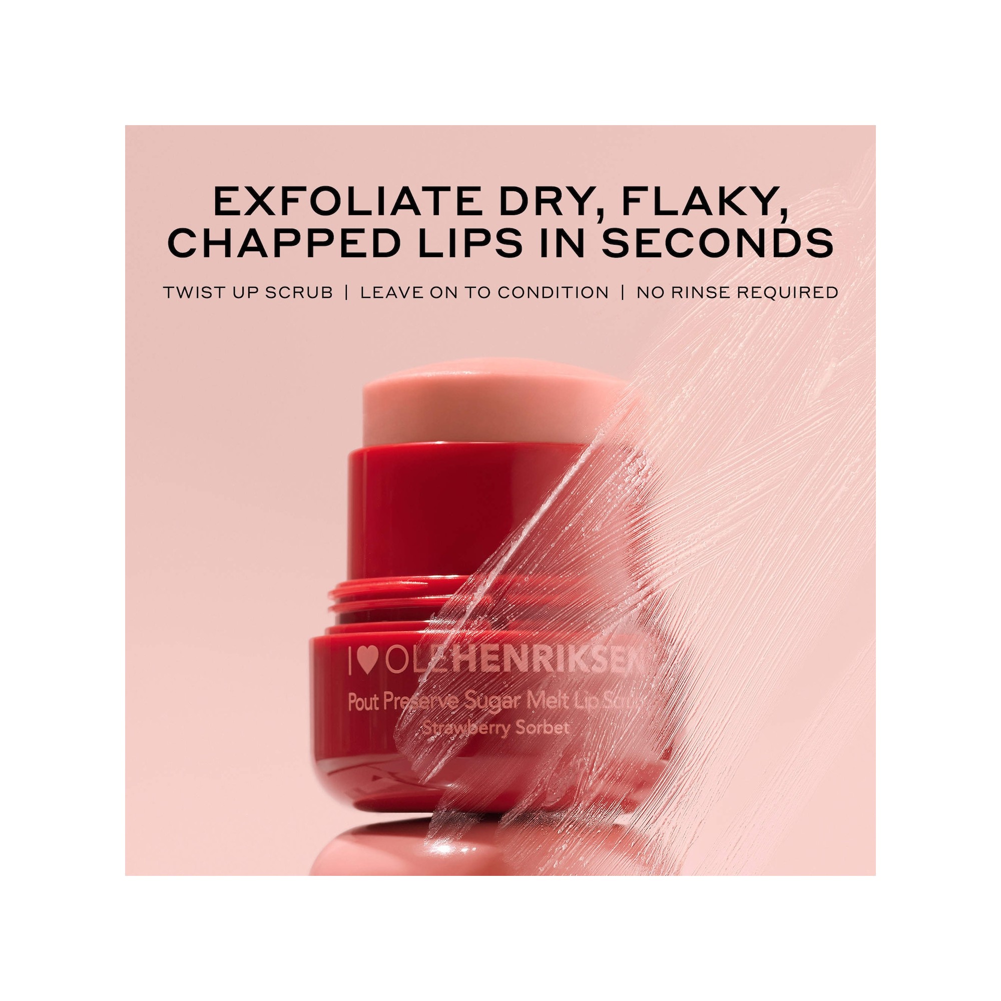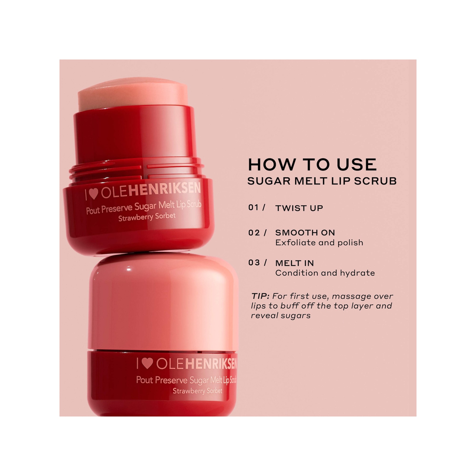 OleHenriksen Pout Preserve Sugar Melt Exfoliating Lip Scrub est un gommage pour les lèvres sans rinçage, formulé avec du sucre fin et du beurre de kokum, qui exfolie en douceur pour des lèvres douces, lisses et hydratées en quelques secondes. Ce gommage sans rinçage exfolie délicatement les lèvres sèches, squameuses et gercées grâce à des sucres ultrafins et des beurres nourrissants. Cette formule innovante retexturise immédiatement les lèvres pour un résultat plus doux et plus lisse en une seule étape. Tournez le stick, appliquez pour exfolier et laissez fondre sur les lèvres : il n’est pas nécessaire d’essuyer ni de rincer. Poursuivez avec votre soin des lèvres préféré pour une hydratation intense et une finition brillante. Le sucre finement granulé exfolie et retexturise les lèvres en douceur tandis que les beurres de kokum, de cacao et de karité nourrissent et assouplissent les lèvres, et que les huiles de coco et de tournesol les nourrissent et les conditionnent. Révélez des lèvres plus douces avec le Sugar Melt Lip Scrub Strawberry d’Ole Henriksen, une formule exfoliante conçue pour éliminer délicatement les rugosités et les textures irrégulières. Infusé de beurres de kokum, de cacao et de karité, associés à du sucre granulé, ce gommage riche en huiles favorise des lèvres visiblement plus lisses et crée une base hydratée idéale pour les préparer.