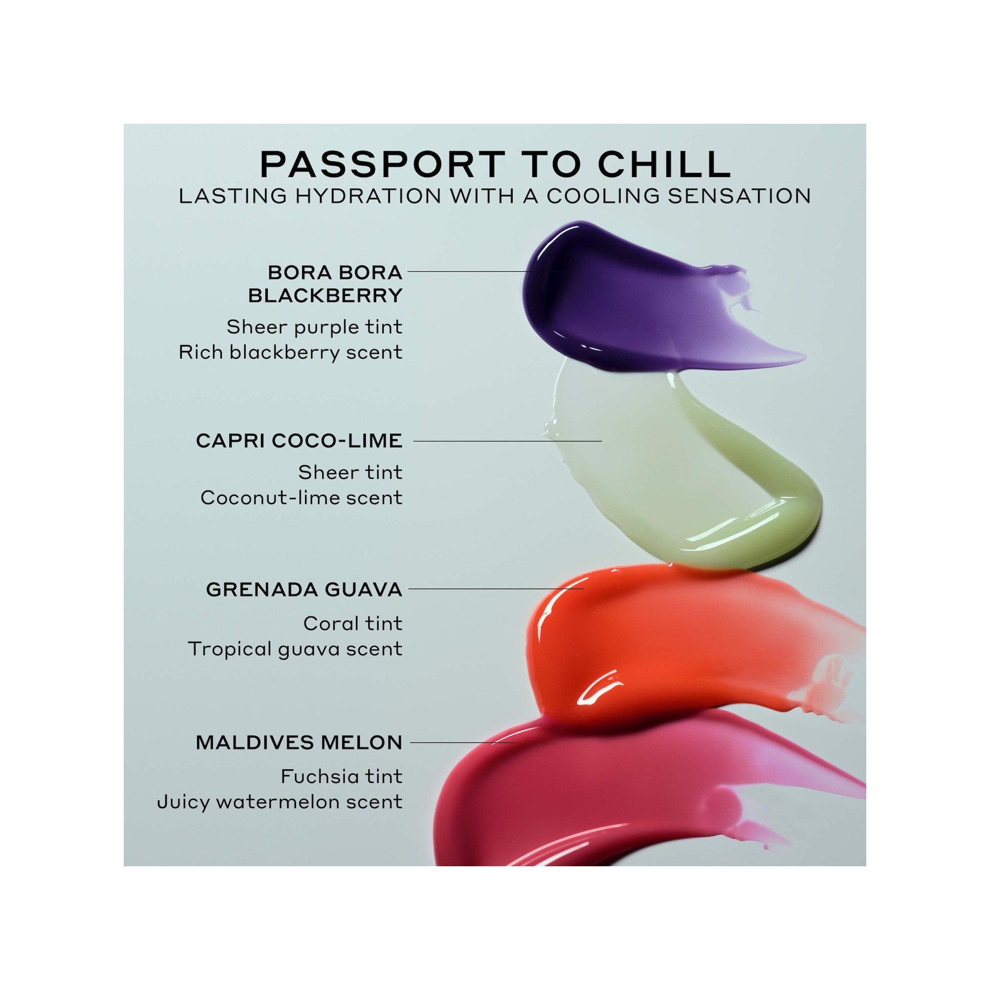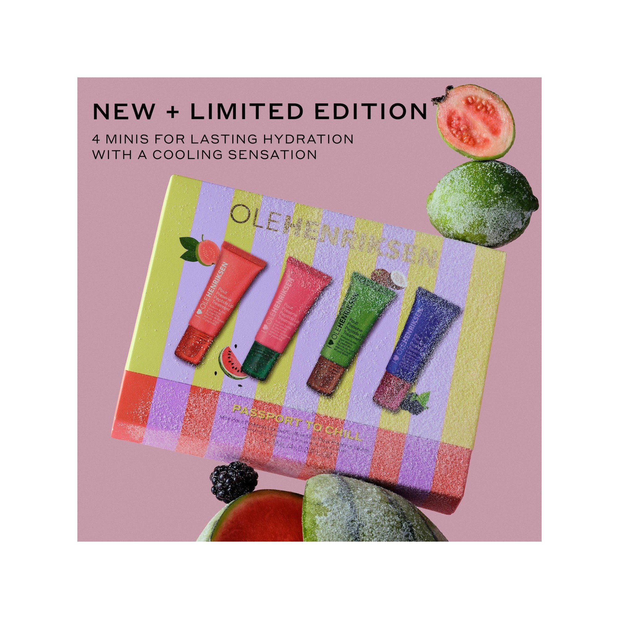 OleHenriksen Passport to Chill Mini Pout Preserve Peptide Lip Set est un coffret en édition limitée réunissant quatre soins pour les lèvres tropicaux Pout Preserve Chillers : Grenada Guava, Maldives Melon, Capri Coco Lime et l’exclusif Bora Bora Blackberry. Des soins hydratants pour les lèvres aux peptides, avec une sensation rafraîchissante, décliné en quatre nouvelles teintes tropicales en édition limitée pour des lèvres visiblement plus pulpeuses en seulement une semaine. Offrez à vos lèvres une pause fraîcheur avec un effet repulpant immédiat. Ces soins ultra-nourrissants en édition limitée procurent une sensation instantanée de fraîcheur tout en apportant une hydratation longue durée et des lèvres visiblement plus volumineuses en une semaine. Formulés avec des peptides spécifiques aux lèvres, des beurres de kokum et de graines de mangue, ainsi que de l’huile de baie arctique (cloudberry), ils lissent visiblement les ridules et aident à restaurer le volume naturel au fil du temps. Leur texture glossy, légère et non collante glisse facilement sur les lèvres, avec trois teintes inspirées des tropiques et des parfums fruités pour une touche rafraîchissante immédiate. Les peptides aident à rendre les lèvres plus pleines et mieux définies, tandis que les beurres de kokum et de mangue nourrissent et adoucissent intensément. L’huile de cloudberry hydrate en profondeur et assouplit les lèvres. Découvrez le Chillers Pout Preserve Lip Treatment de Ole Henriksen, un soin en édition limitée pensé pour sublimer les lèvres avec un fini brillant, légèrement teinté et confortable. Idéal pour une bouche pulpeuse, lisse et éclatante de fraîcheur.