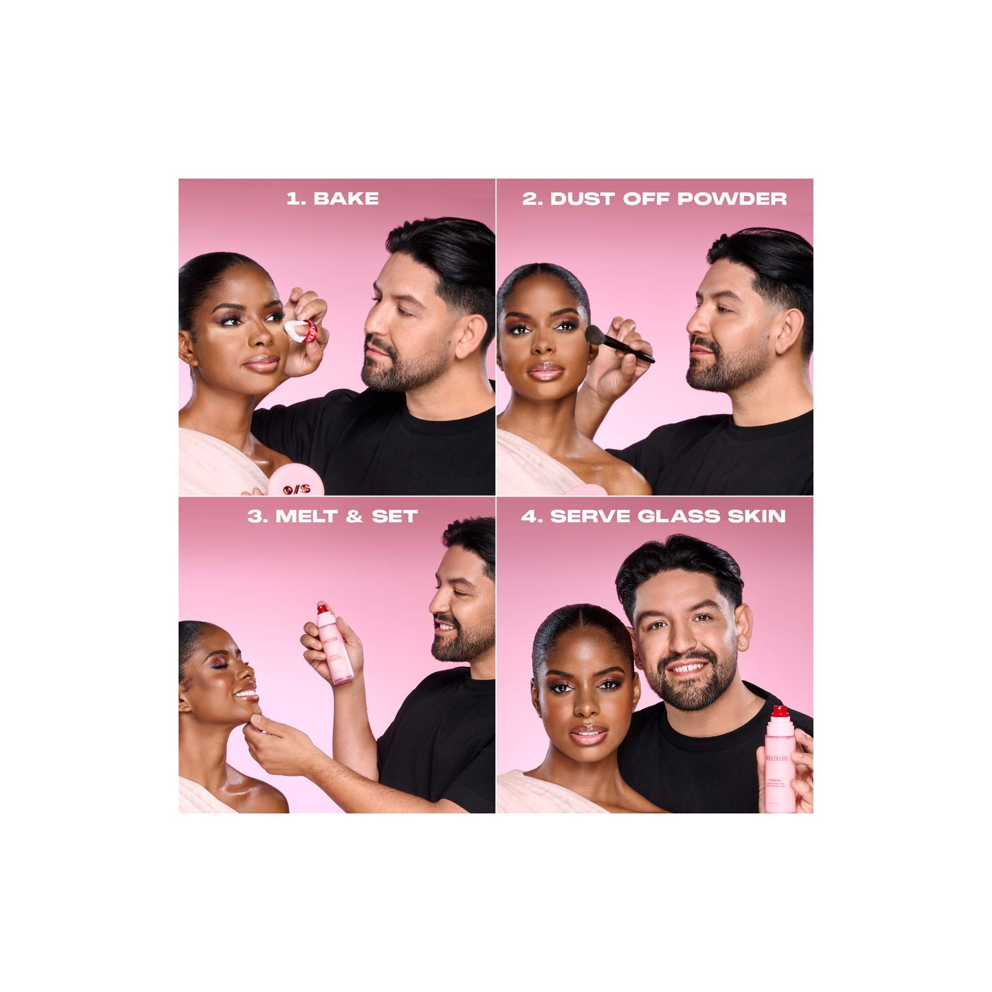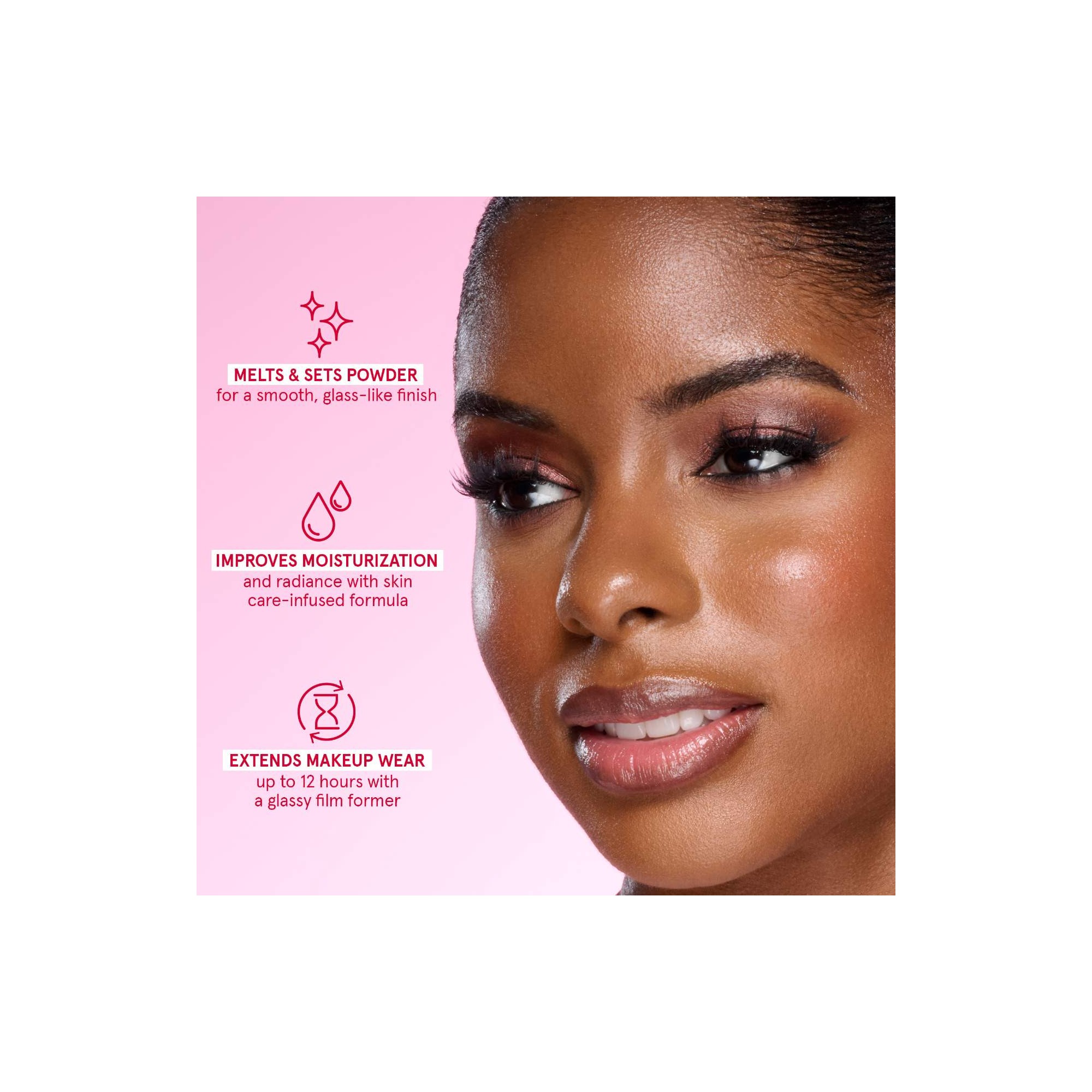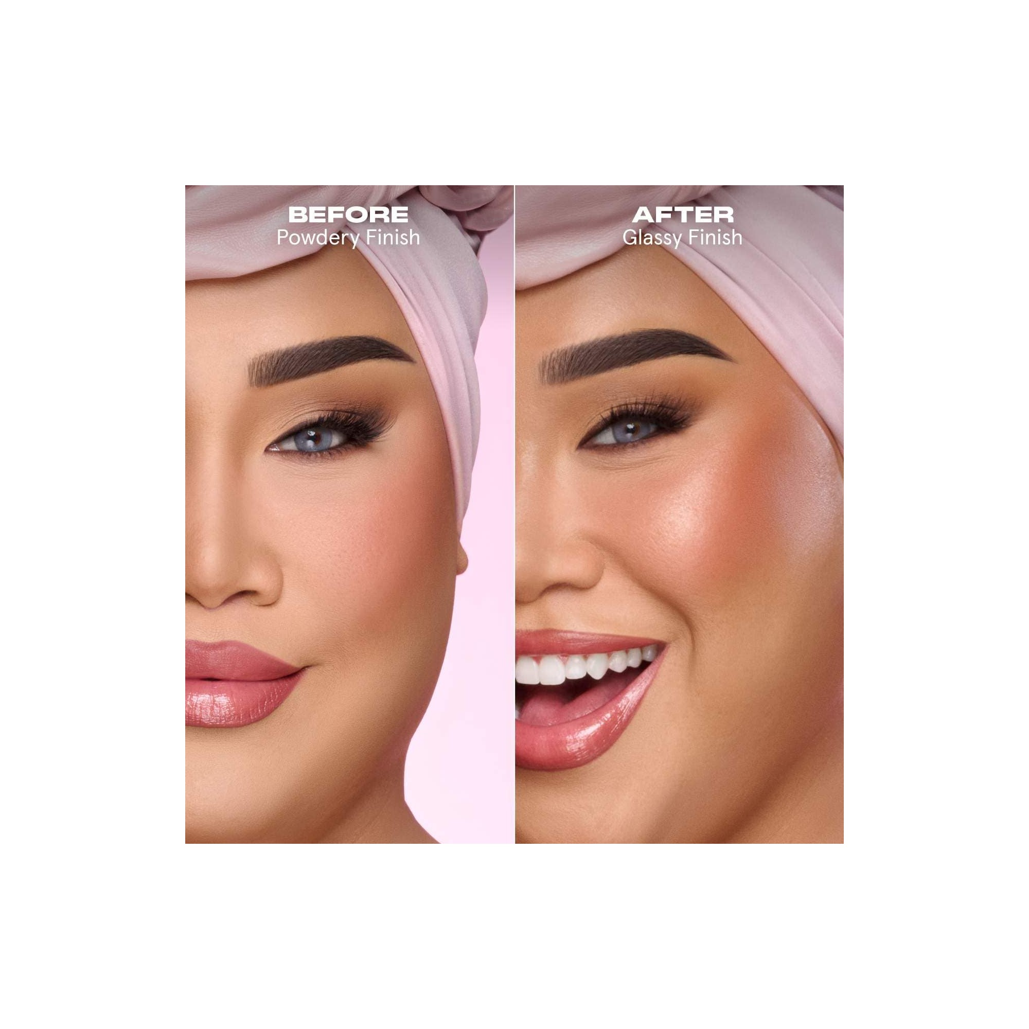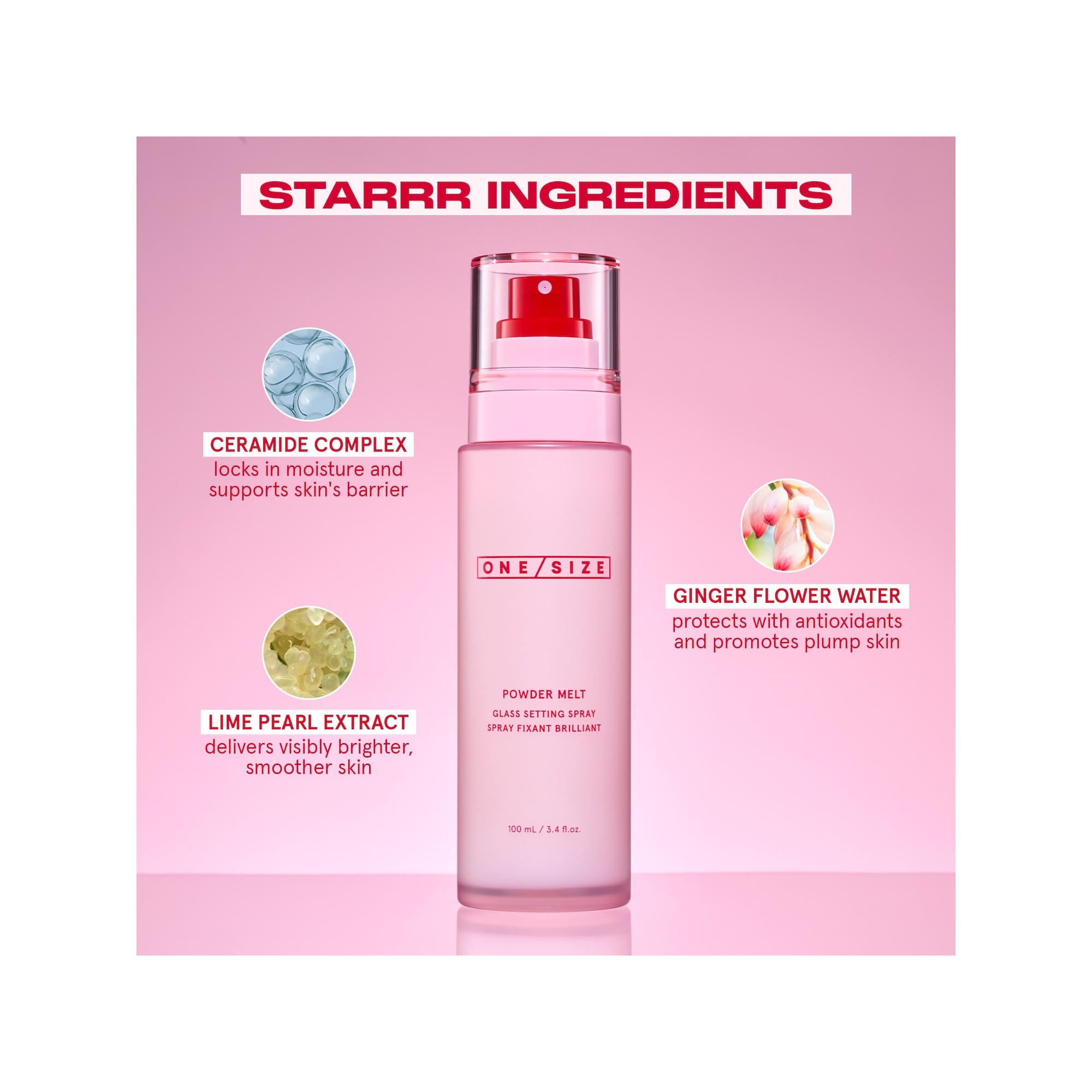 One/Size By Patrick Starrr Powder Melt Glass Setting Spray est un spray fixateur hydratant infusé de soins qui fusionne parfaitement les couches de poudres pour un fini lumineux et effet “verre” qui dure toute la journée. Sa formule cliniquement prouvée prolonge la tenue du maquillage jusqu’à 12 heures tout en améliorant l’éclat, la texture et l’hydratation de la peau, immédiatement et au fil du temps. Le film formateur effet glassy crée une surface ultra-lisse, tandis que les céramides apportent une hydratation durable. Non comédogène et adapté aux peaux sensibles, ce spray agit comme un véritable soin. Le complexe de céramides renforce la barrière cutanée, prévient la perte d’humidité et adoucit la peau. L’eau de fleur de gingembre offre une protection antioxydante et contribue à une peau rebondie et éclatante de santé. L’extrait de lime pearl exfolie en douceur pour une peau visiblement plus lumineuse et plus lisse. Ce spray fixateur hydratant fond et fixe les poudres pour un fini lisse, lumineux et longue tenue. Sa formule enrichie en actifs soin fixe le maquillage jusqu’à 12 heures tout en améliorant l’hydratation et l’éclat du teint. Le complexe de céramides procure une hydratation durable, et l’eau de fleur de gingembre aide à revitaliser la peau pour un aspect frais et pulpeux. À utiliser avant le maquillage pour une hydratation instantanée ou en retouche au cours de la journée pour raviver l’éclat.