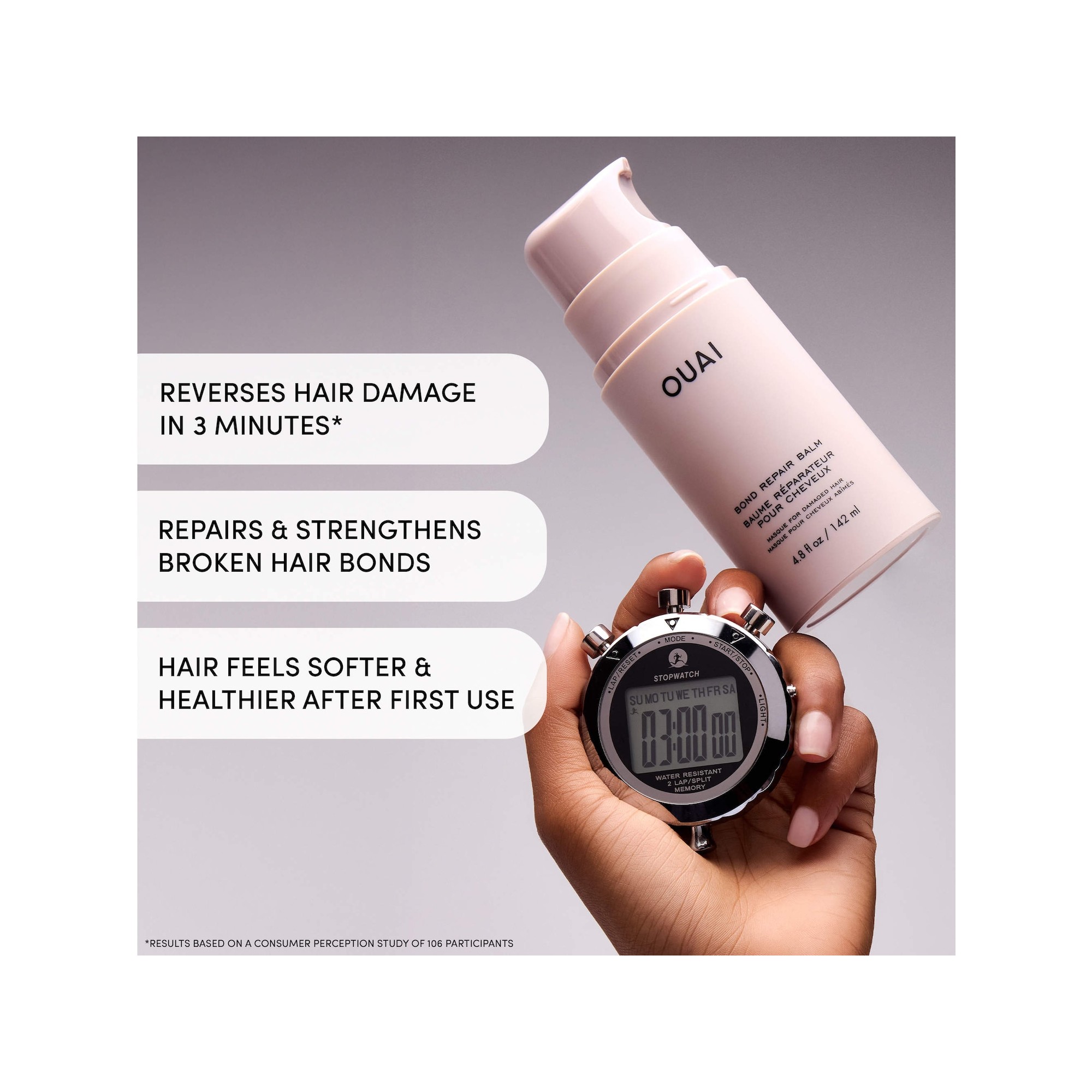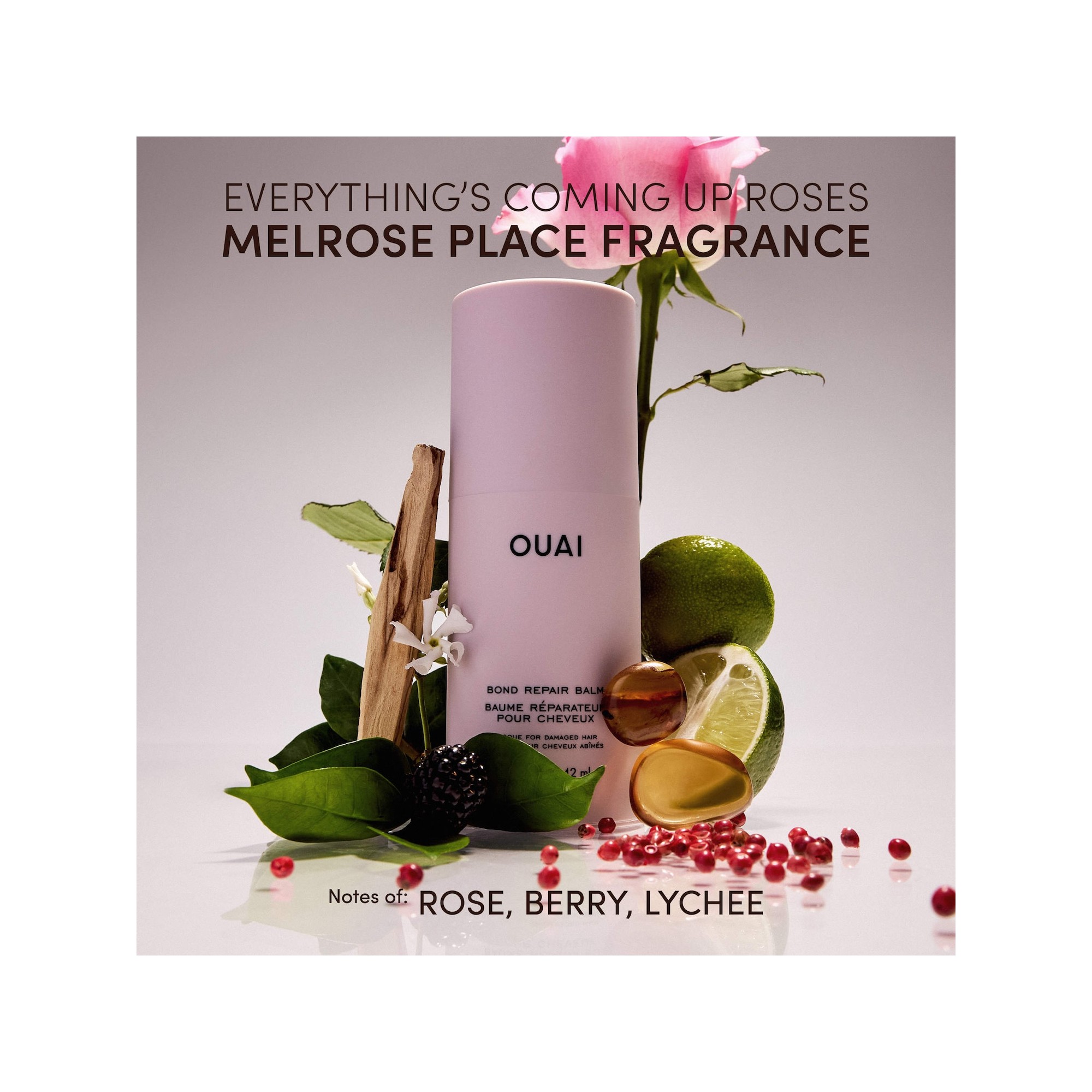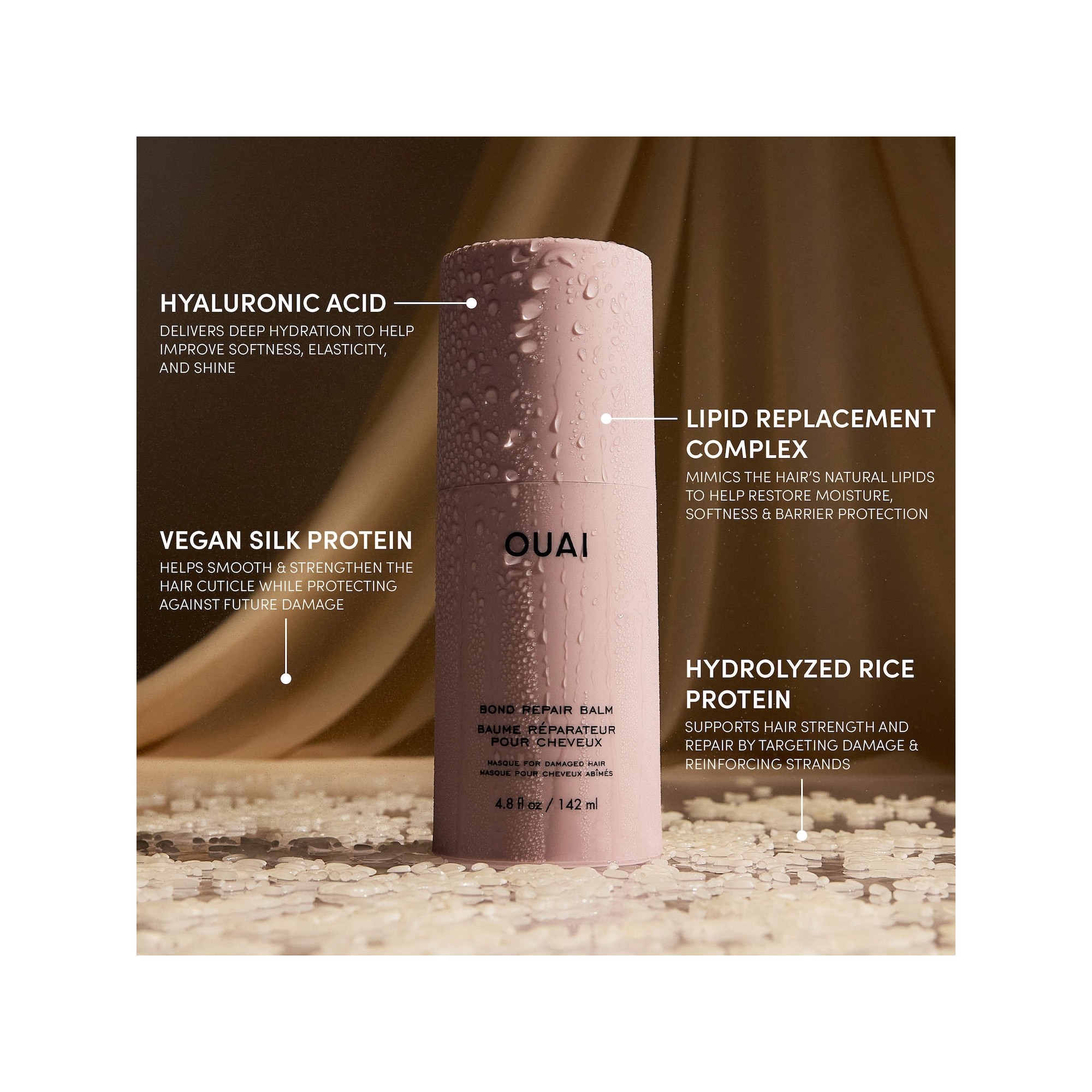 Ouai Bond Repair Balm Hair Mask for Damaged Hair est un baume capillaire qui prend soin des cheveux secs et abîmés par la chaleur, les colorations, la casse et les pointes fourchues en seulement trois minutes. Ciblez les dommages capillaires en un minimum de temps avec le masque Bond Repair Balm pour cheveux abîmés. Une seule pression suffit pour réparer les liaisons capillaires fragilisées tout en renforçant la barrière du cheveu, le tout sans quitter votre douche. Son parfum Melrose Place, inspiré de Los Angeles, dévoile une senteur riche et veloutée de rose, mêlée à des notes envoûtantes de bergamote, litchi, musc blanc et champagne. Les notes de tête associent champagne, baies, poivre rose et litchi, suivies d’un cœur floral de pivoine, rose, freesia, jasmin et bergamote, sur un fond chaud d’ambre, bois de santal, musc blanc et bois de cèdre. La protéine de soie végétale lisse et renforce la cuticule du cheveu, tandis que l’acide hyaluronique apporte une hydratation intense pour améliorer douceur, élasticité et brillance. Les peptides issus de protéines de riz hydrolysées aident à renforcer et réparer les cheveux en ciblant les zones abîmées.