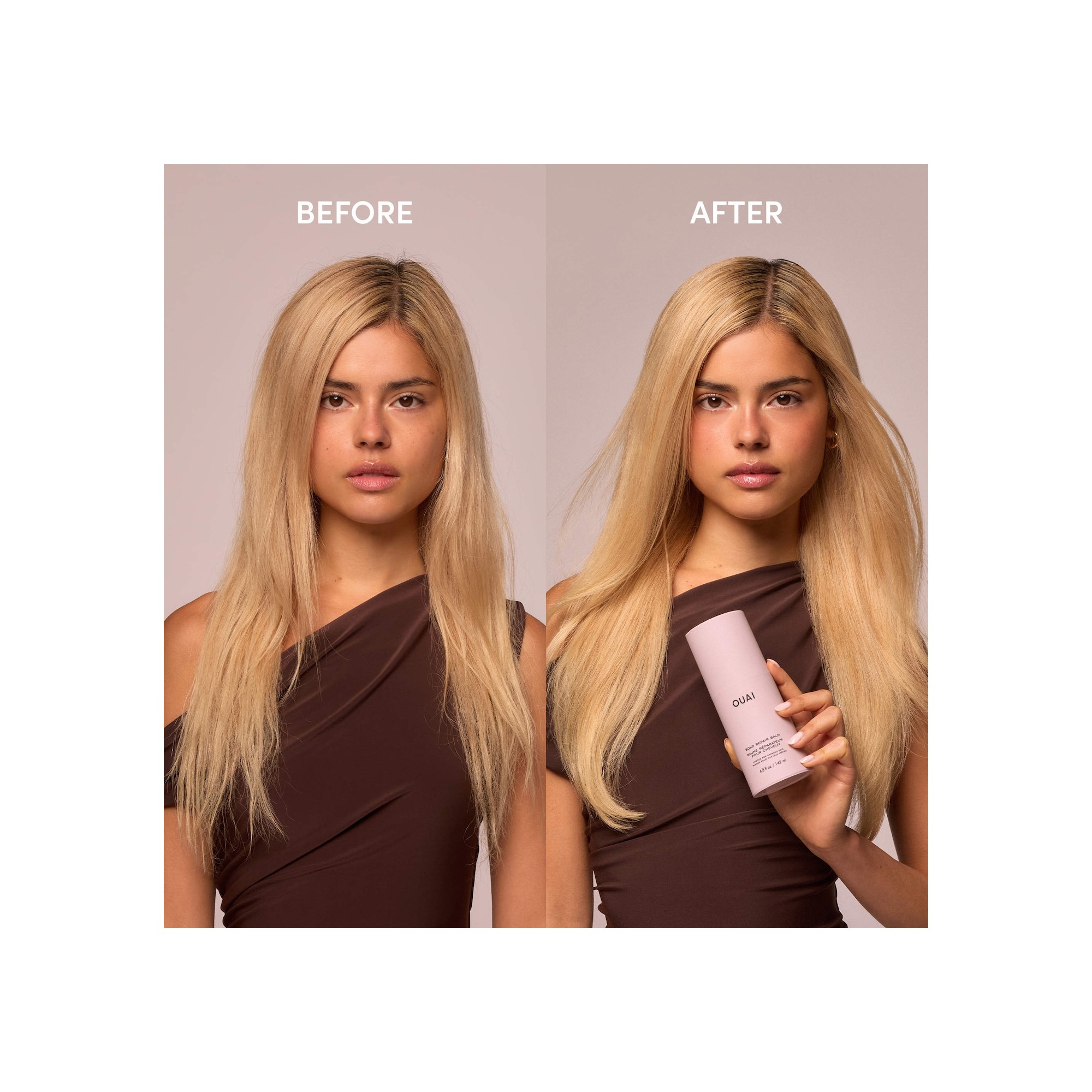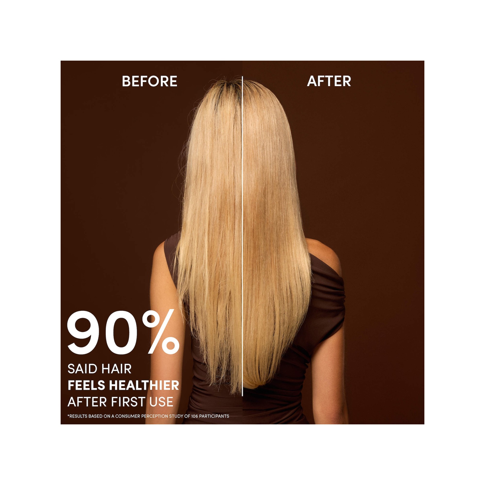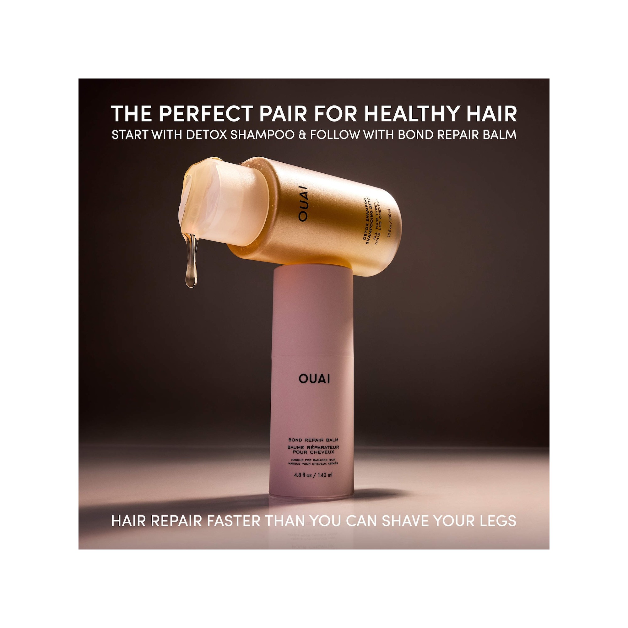 Ouai Bond Repair Balm Hair Mask for Damaged Hair est un baume capillaire qui prend soin des cheveux secs et abîmés par la chaleur, les colorations, la casse et les pointes fourchues en seulement trois minutes. Ciblez les dommages capillaires en un minimum de temps avec le masque Bond Repair Balm pour cheveux abîmés. Une seule pression suffit pour réparer les liaisons capillaires fragilisées tout en renforçant la barrière du cheveu, le tout sans quitter votre douche. Son parfum Melrose Place, inspiré de Los Angeles, dévoile une senteur riche et veloutée de rose, mêlée à des notes envoûtantes de bergamote, litchi, musc blanc et champagne. Les notes de tête associent champagne, baies, poivre rose et litchi, suivies d’un cœur floral de pivoine, rose, freesia, jasmin et bergamote, sur un fond chaud d’ambre, bois de santal, musc blanc et bois de cèdre. La protéine de soie végétale lisse et renforce la cuticule du cheveu, tandis que l’acide hyaluronique apporte une hydratation intense pour améliorer douceur, élasticité et brillance. Les peptides issus de protéines de riz hydrolysées aident à renforcer et réparer les cheveux en ciblant les zones abîmées.