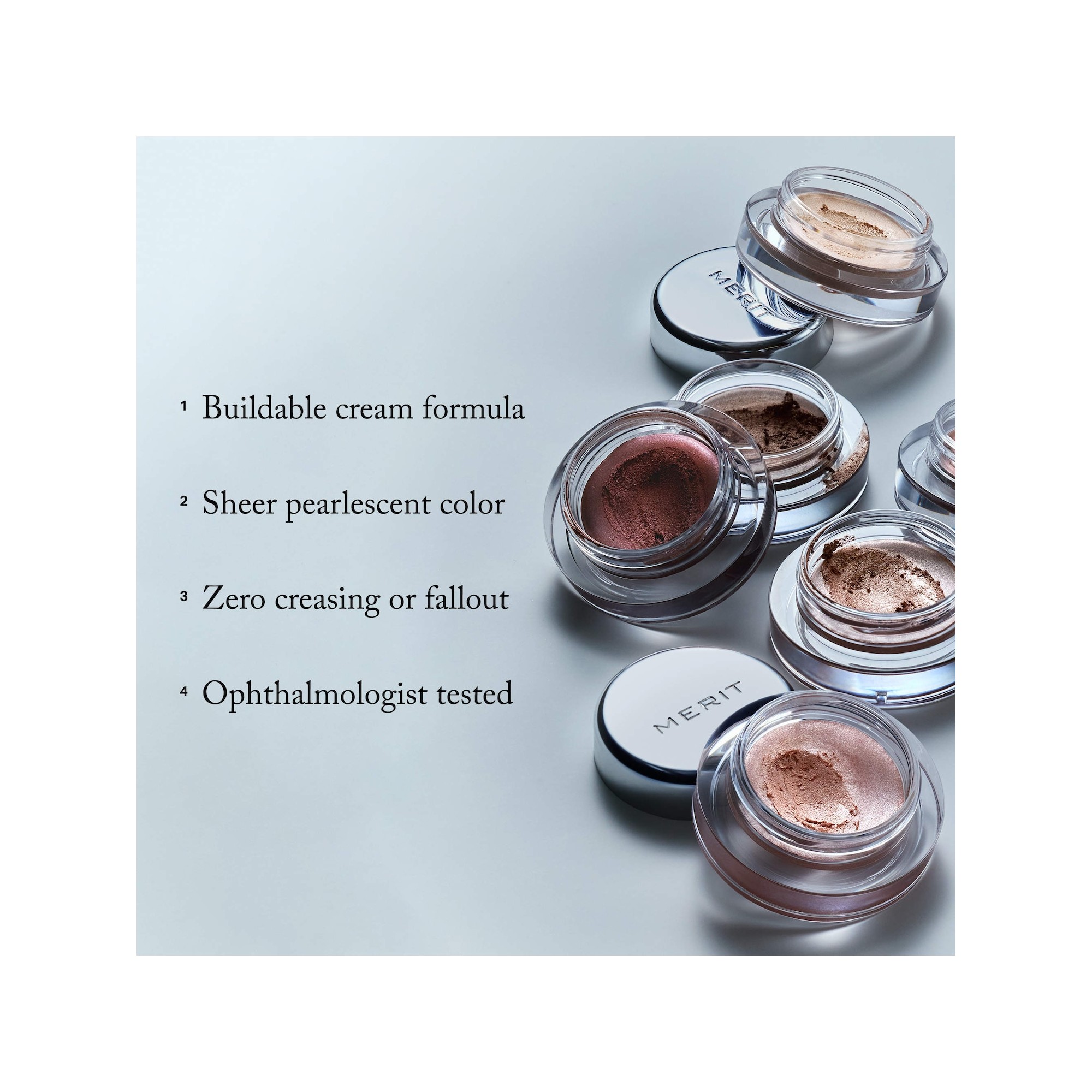 Merit Solo Shadow Cream Eyeshadow Sheen est une ombre à paupières crème modulable qui offre un voile léger de couleur, désormais disponible en deux finis. Cette formule confortable s’applique facilement, se travaille sans effort et tient toute la journée sans filer dans les plis ni faire de chutes. Disponible en fini mat ou nacré lumineux, sa texture crémeuse et estompable glisse sur la paupière puis se fixe en un fini lisse. Elle peut se porter seule pour un effet naturel ou superposée pour plus d’intensité et de profondeur. L’extrait de jojoba apporte une texture crème douce et facile à estomper, tandis que les micro-perles offrent un voile de couleur multidimensionnel.