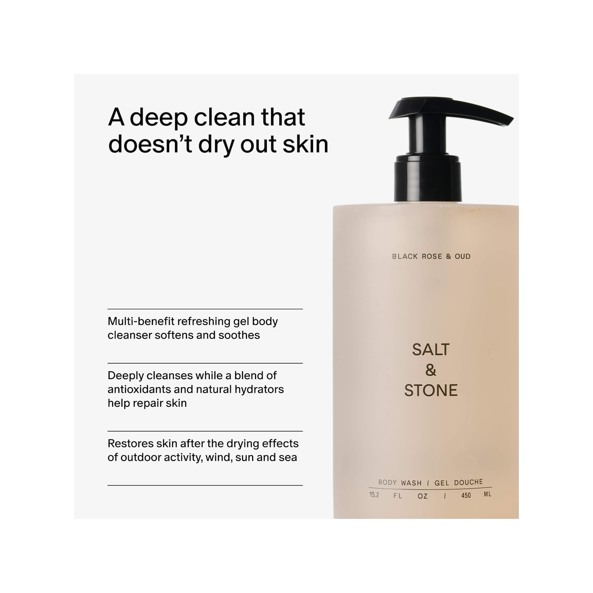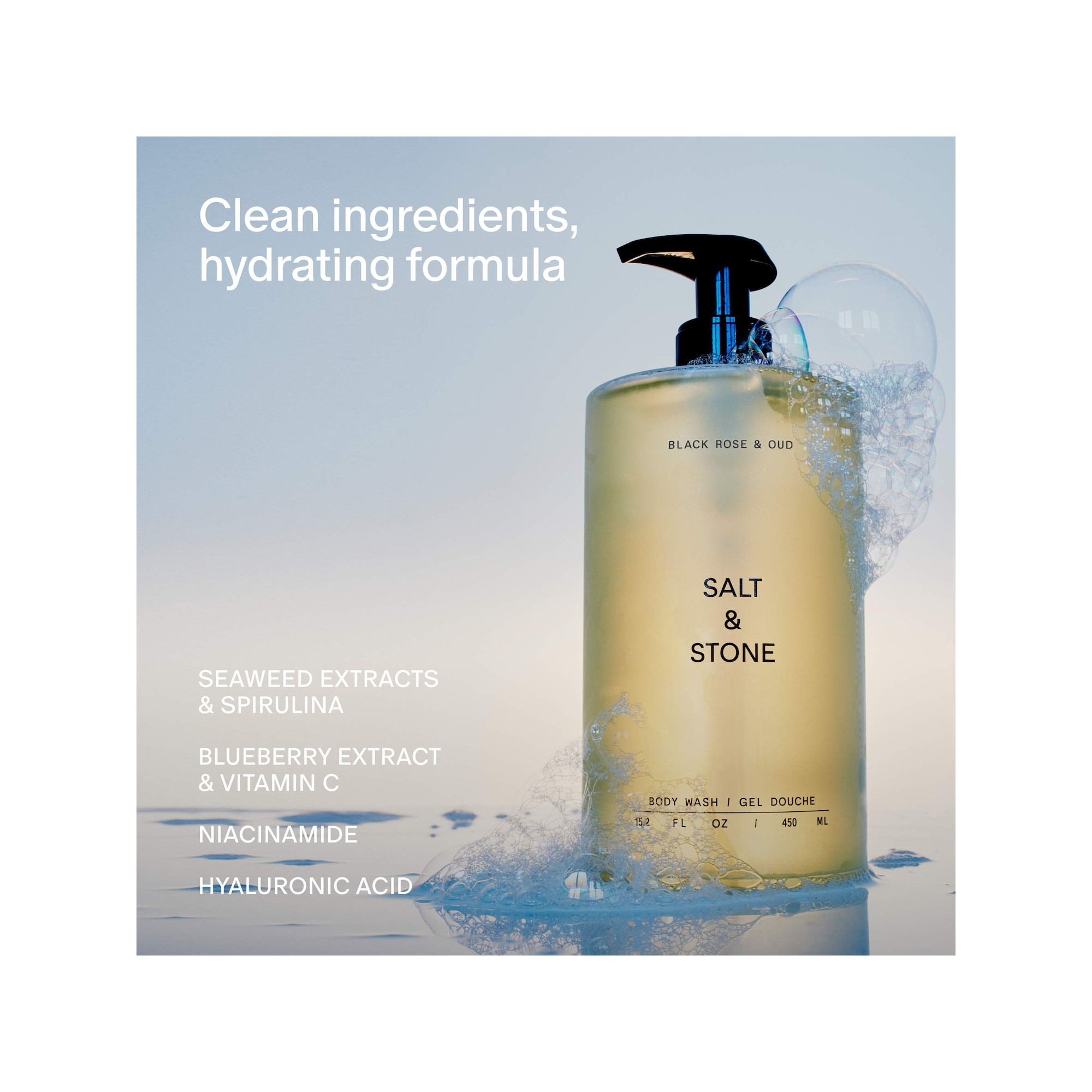 Salt & Stone Black Rose & Oud Refillable Body Wash with Niacinamide + Probiotic est un gel nettoyant pour le corps au parfum irrésistible, infusé d’actifs botaniques marins, de niacinamide et de probiotiques pour adoucir, apaiser et restaurer la peau. Il s’agit d’un gel nettoyant corporel rafraîchissant au parfum envoûtant et recentrant Black Rose & Oud. Rose noire et oud est inspiré par l'atmosphère d'un soir idyllique. La rose noire et le muguet offrent une douce introduction florale tandis que l'oud et l'acajou créent une note de cœur boisée pleine d'exotisme. Le vétiver ancre le parfum dans une note verte, doucement réchauffée par le santal blanc et l'ambre. Formulé pour adoucir et apaiser, ce nettoyant quotidien aide à contrer les effets desséchants des activités extérieures, du vent, du soleil et de la mer. La niacinamide soutient une barrière cutanée plus forte afin d’améliorer visiblement la texture de la peau, tandis que les probiotiques neutralisent les odeurs et combattent les bactéries. Les actifs botaniques marins riches en antioxydants ainsi que la vitamine C issue de l’extrait de myrtille luttent contre les radicaux libres causés par l’exposition au soleil, renforçant la production de collagène de la peau et aidant à prévenir les signes visibles du vieillissement. Les extraits d’algues et la spiruline, riches en antioxydants, apaisent la peau irritée, tandis que la niacinamide renforce la barrière cutanée et améliore visiblement la texture de la peau, et les probiotiques équilibrent le microbiome cutané afin de neutraliser les odeurs et de reconstituer les bonnes bactéries.