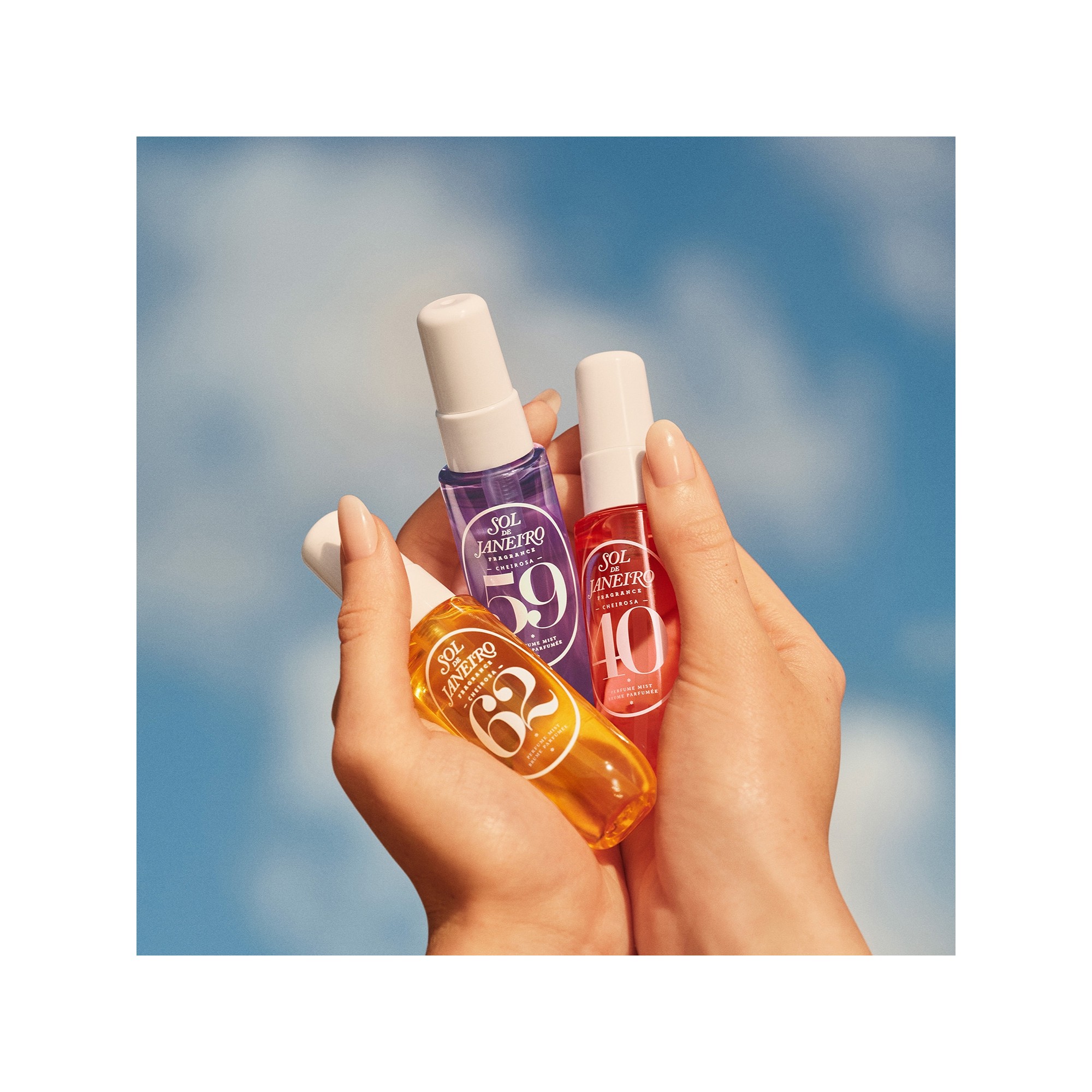 Sol de Janeiro Sunny.Sultry.Delicious. Cheirosa Perfume Mist Set est un coffret de trois brumes parfumées. Découvrez le coffret de 3 brumes parfumées Sol de Janeiro, une invitation à plonger dans l'esprit vibrant du Brésil : au Brésil, Cheirosa signifie sentir délicieusement bon. Portez chaque brume seule, superposez-les entre elles ou avec d'autres parfums de votre collection pour créer une signature olfactive qui vous ressemble. Conçues avec la technologie Scent Imprint de Sol de Janeiro, ces brumes parfumées iconiques vous accompagnent tout au long de la journée : Cheirosa 62™ : Parfum gourmand et ensoleillé, aux notes de pistache et de caramel salé. Cheirosa 40 : Parfum floral et chaud, aux notes de prune noire ambrée et de bois vanillé. Cheirosa 59 : Parfum boisé et gourmand, aux notes d'orchidée vanillée et de bois de santal.