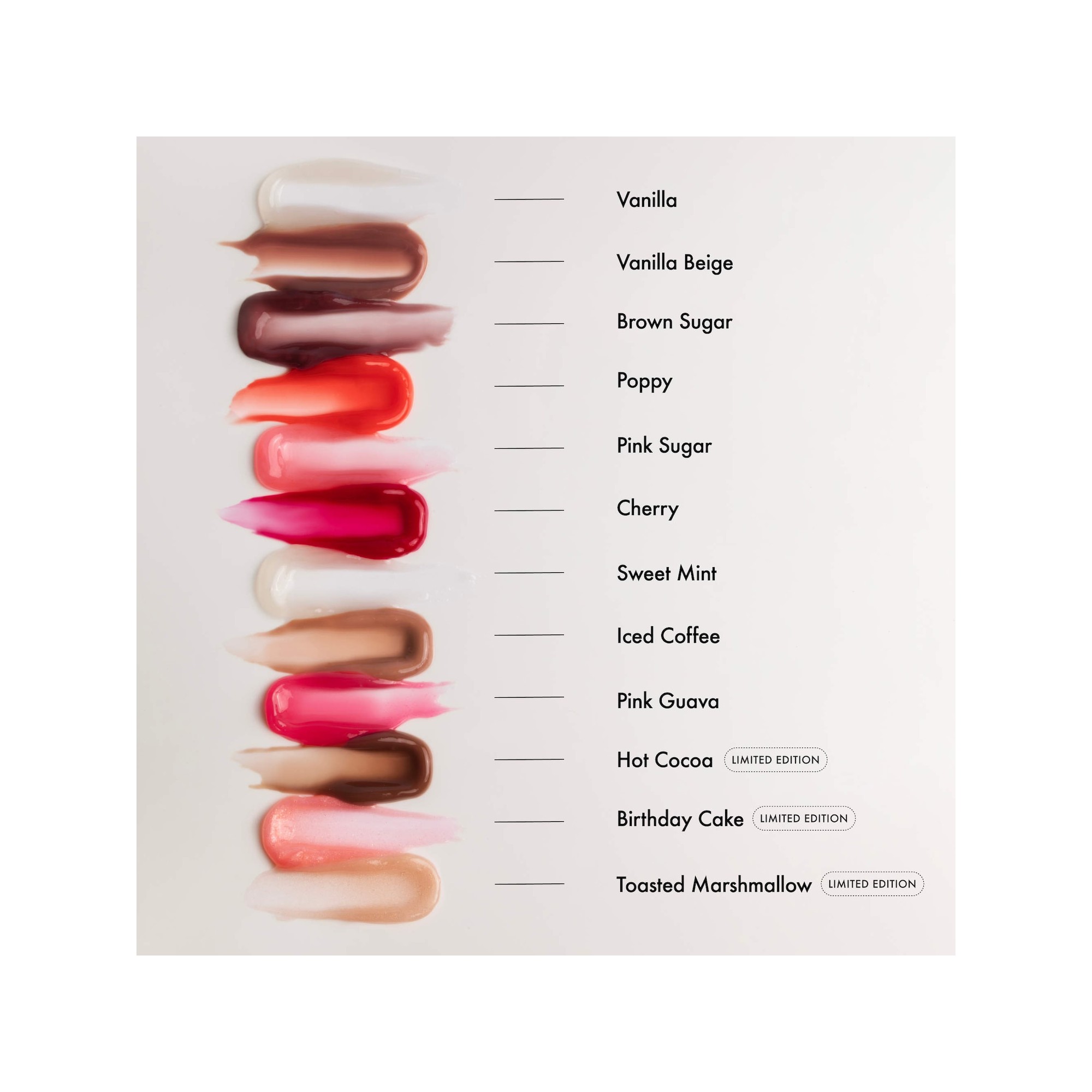 Summer Fridays The Lip Butter Balm Vault est un coffret en édition limitée regroupant les 12 baumes primés de Summer Fridays, dont trois parfums exclusifs, présentés dans une trousse de voyage en cuir végane. Découvrez l’alliance parfaite entre hydratation fondante et éclat instantané. Le Lip Butter Balm de Summer Fridays, à la texture soyeuse et végane, nourrit et adoucit les lèvres sèches tout en scellant une hydratation durable à chaque application. Vanilla est transparent avec une touche de douceur vanillée. Sweet Mint est transparent avec une note de menthe sucrée. Vanilla Beige est beige avec une pointe de vanille. Brown Sugar est une teinte brun rosé au goût subtil de sucre roux. Poppy est un corail éclatant à la douceur d’agrumes. Pink Sugar est rose avec une touche de sucre sucré. Cherry est rouge avec une note fruitée de cerise. Iced Coffee est brun avec une touche de café glacé. Pink Guava est rose vif avec un parfum de goyave juteuse. L’édition limitée Hot Cocoa est une teinte chocolat chaud avec une note riche de cacao. L’édition limitée Toasted Marshmallow présente des reflets dorés avec une touche de guimauve grillée. L’édition limitée Birthday Cake dévoile un rose clair nacré avec un parfum de gâteau d’anniversaire. Les beurres de karité et de graines de murumuru sont des hydratants naturels qui apaisent, soulagent et nourrissent les lèvres, tandis que les cires végétales les adoucissent et leur apportent une brillance durable, sans effet gras.
