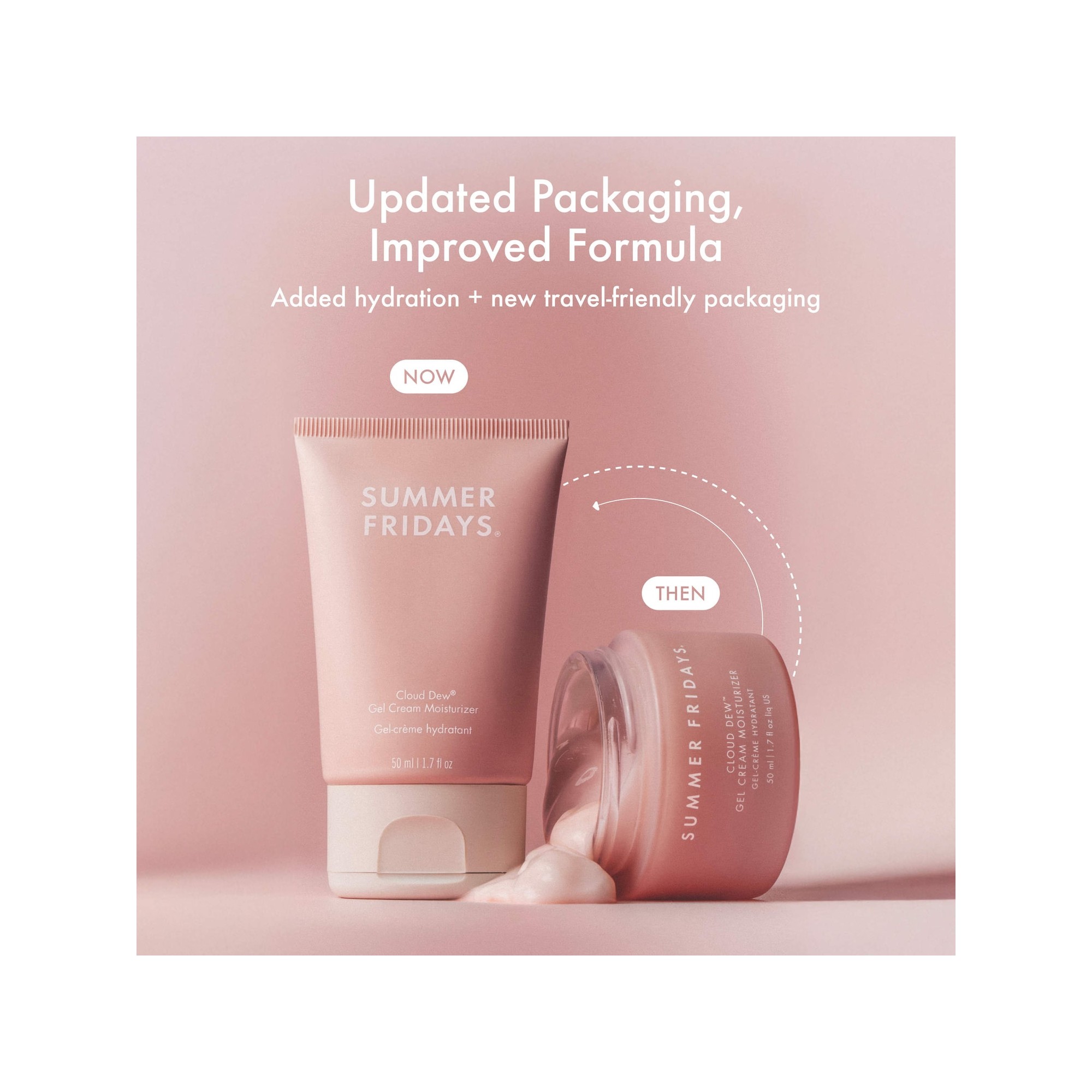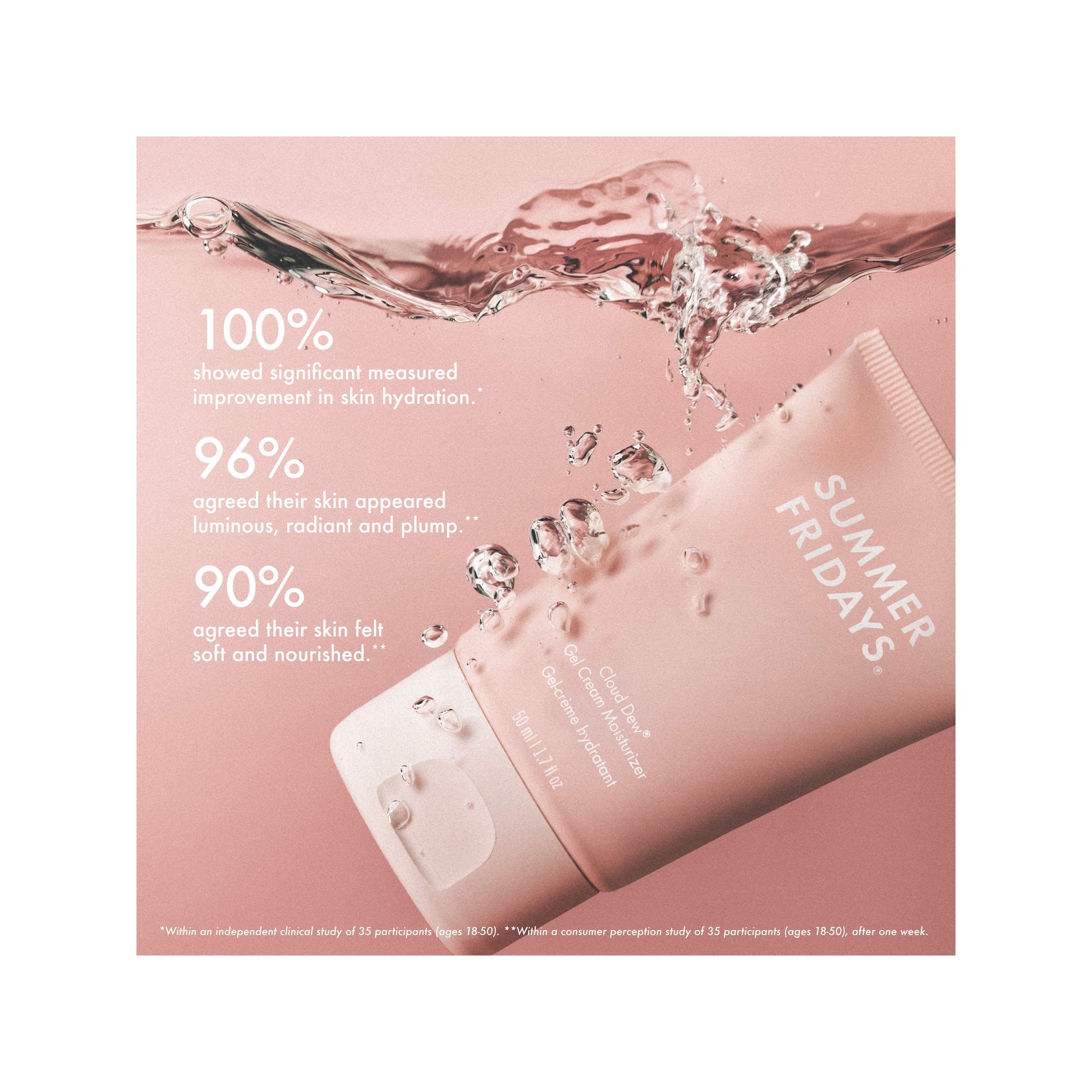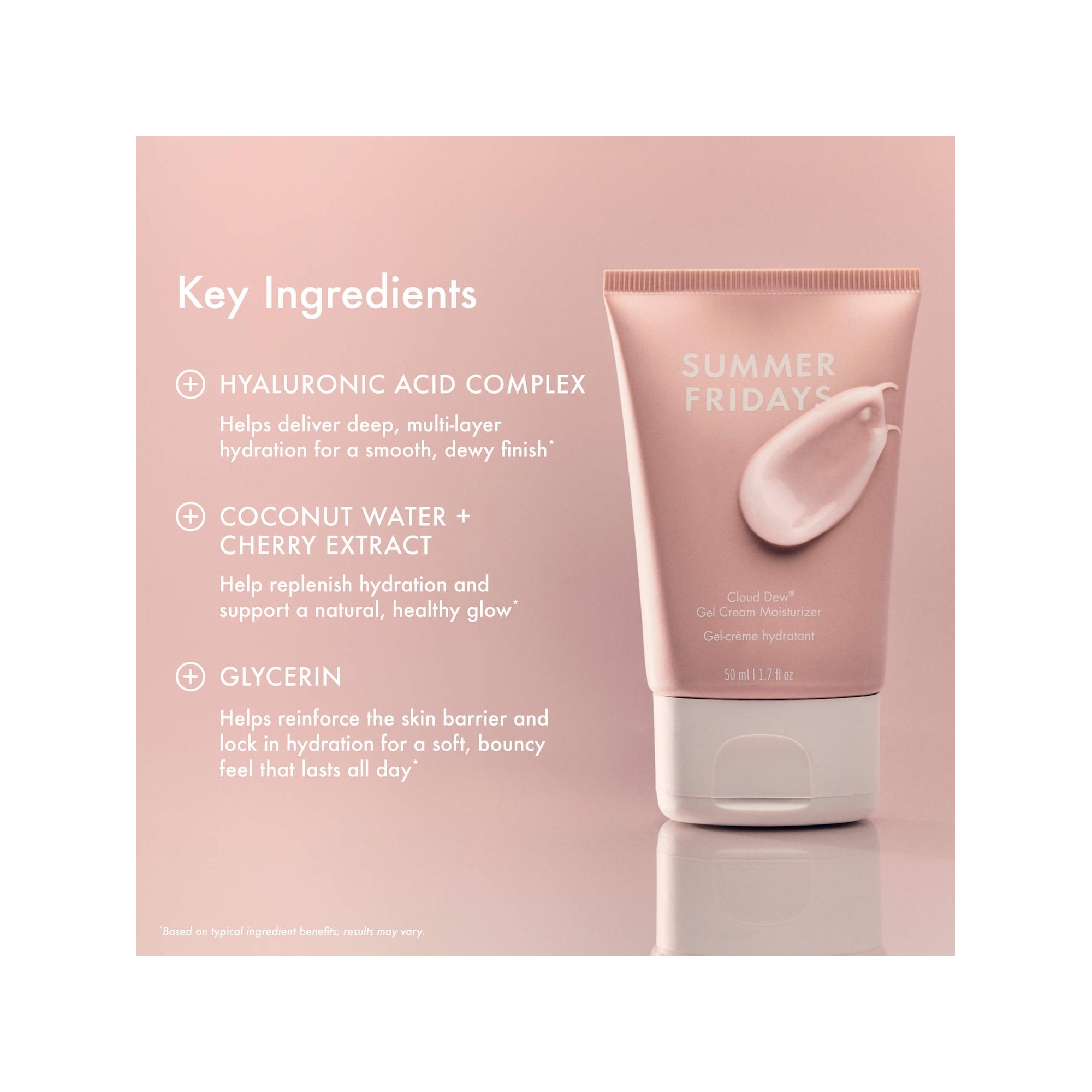 Summer Fridays Cloud Dew Gel Cream Moisturizer est une crème gel hydratante légère et végane, format deluxe, qui infuse la peau de trois formes d’acide hyaluronique, d’eau de coco et de céramides pour une hydratation longue durée. Formulée pour tous les types de peau, y compris les peaux sensibles, grasses et mixtes, cette crème gel ultra-légère renforce la barrière d’hydratation, repulpe visiblement la peau et restaure l’hydratation pour un teint doux, lumineux et éclatant. L’eau de coco et l’extrait de cerise forment un duo fruité qui recharge la peau en hydratation et soutient un éclat sain. Le complexe d’acide hyaluronique offre une hydratation intense et multicouche pour un fini lisse et frais. La glycérine renforce la barrière cutanée et retient l’hydratation pour une peau rebondie. Soyeuse, fraîche et aérienne sur la peau, retrouvez tout son rebond avec la nouvelle version de la Cloud Dew Gel Cream Moisturiser de Summer Fridays. Une peau heureuse, saine et hydratée grâce à cette formule légère comme un nuage et douce comme une plume. Repensée pour améliorer la résistance et l’éclat, elle associe trois poids moléculaires d’acide hyaluronique pour réhydrater la peau en profondeur, tandis que les céramides renforcent sa barrière naturelle et que la glycérine scelle une hydratation durable. Avec une touche finale d’eau de coco et d’extrait de cerise, attendez-vous à une peau repulpée et lumineuse, réunie dans une seule crème aérienne.