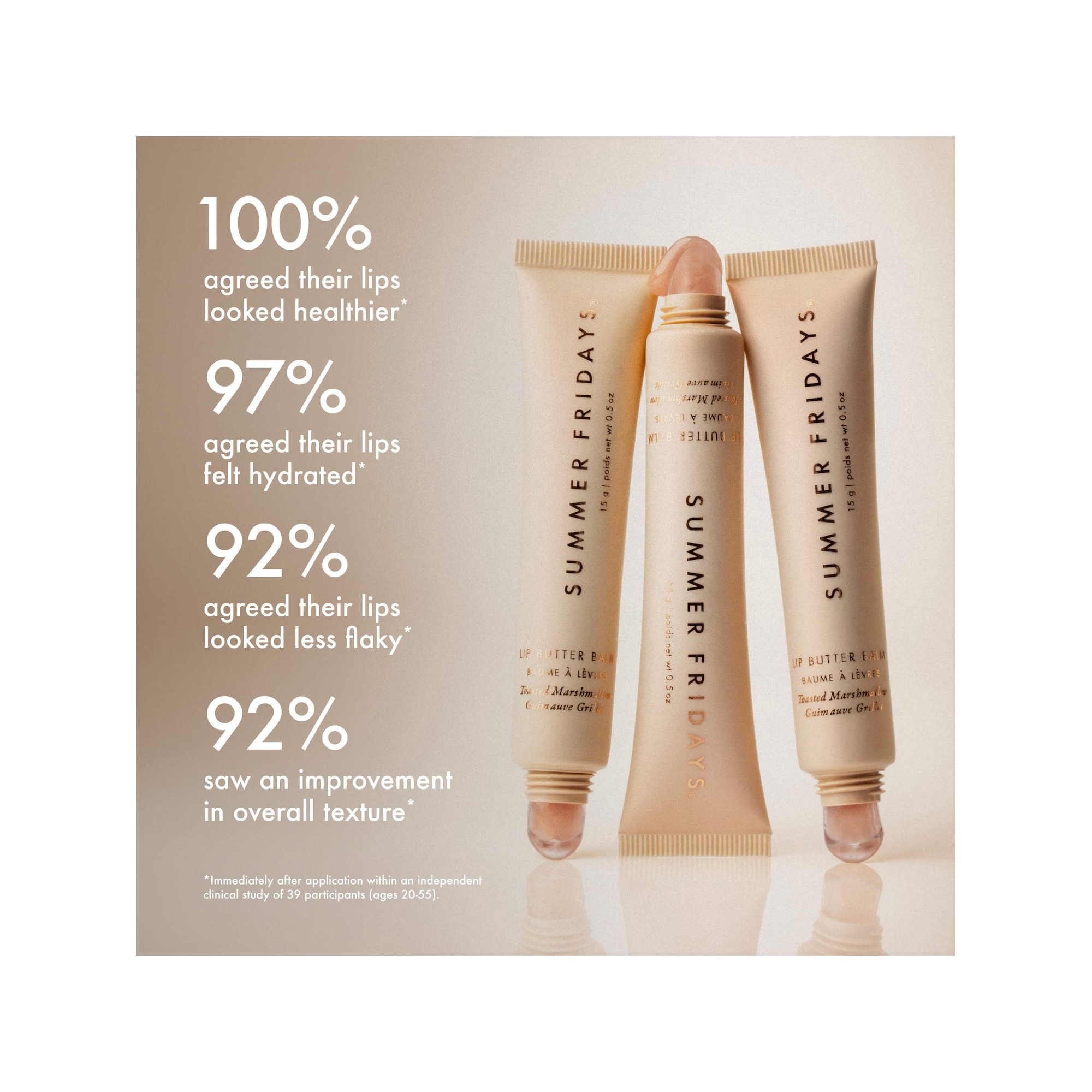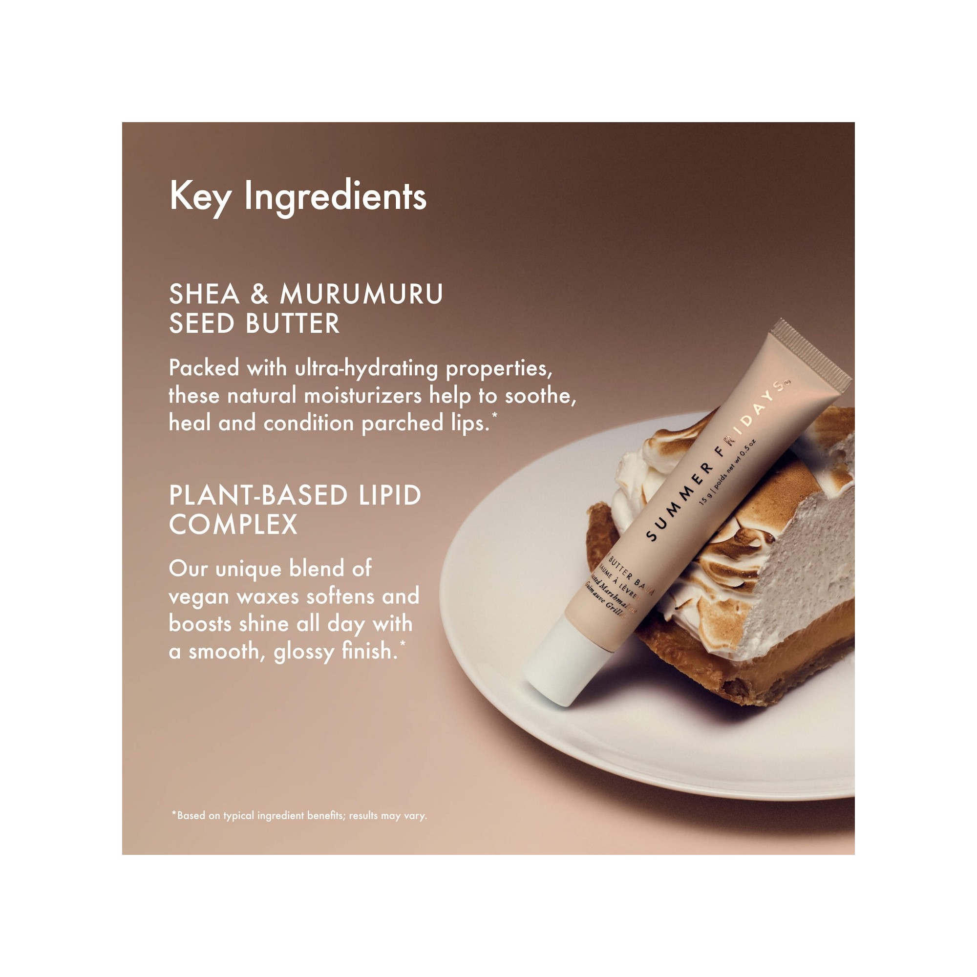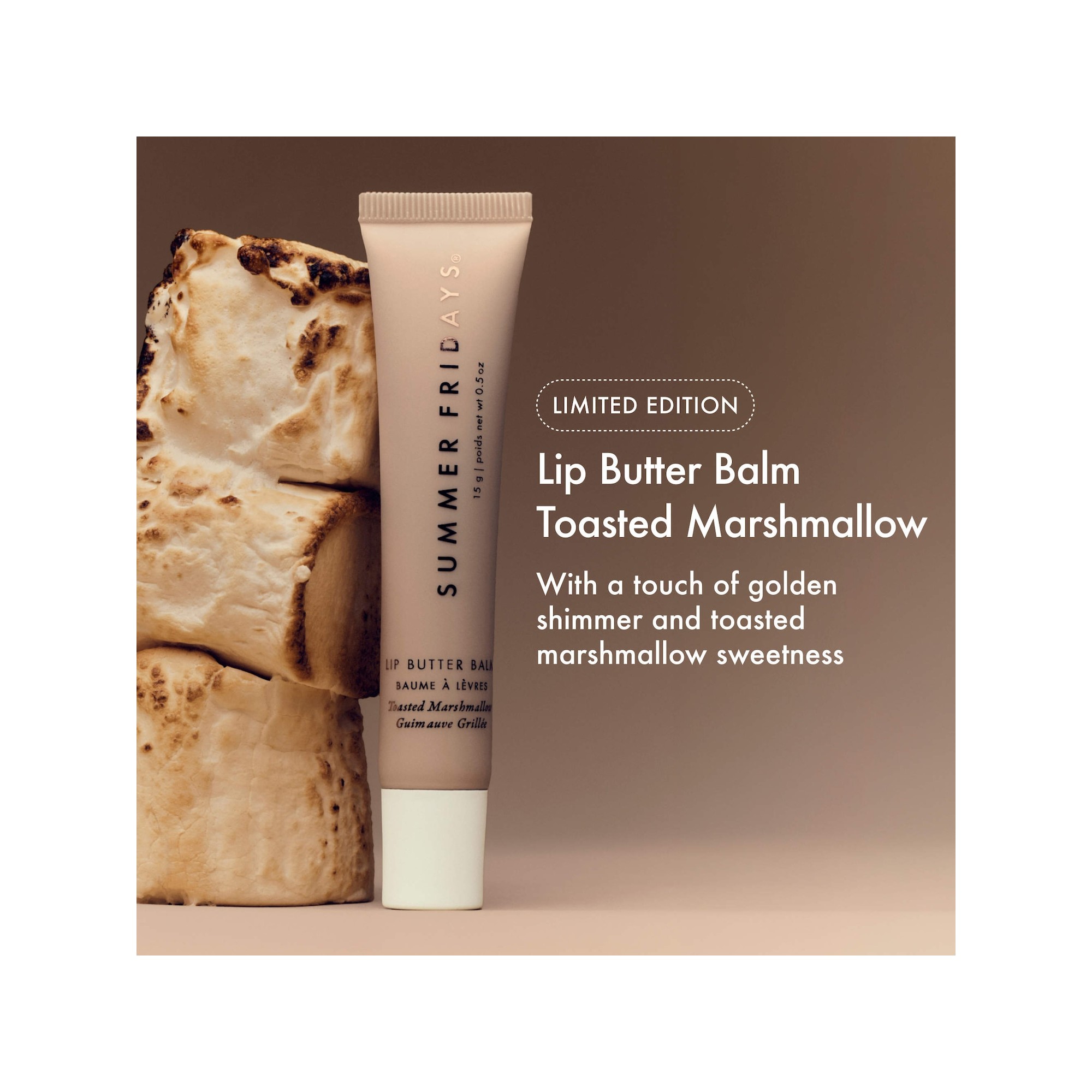 Summer Fridays Lip Butter Balm Toasted Marshmallow est un baume végétalien soyeux qui hydrate et apaise les lèvres desséchées en quelques secondes. Cette formule procure une hydratation apaisante aux lèvres desséchées et s'applique avec facilité sur le pouce pour une touche rapide d'hydratation et de brillance, ou au coucher comme masque de nuit nourrissant. Ce baume à lèvres est formulé avec des beurres de graines de karité et de murumuru hydratants naturels qui apaisent, soulagent et revitalisent les lèvres desséchées, ainsi que des cires végétaliennes pour adoucissir et booster la brillance toute la journée avec une texture lisse jamais grasse. Il se distingue par un parfum naturel de vanille qui emporte vos sens lors d'une douce escapade.