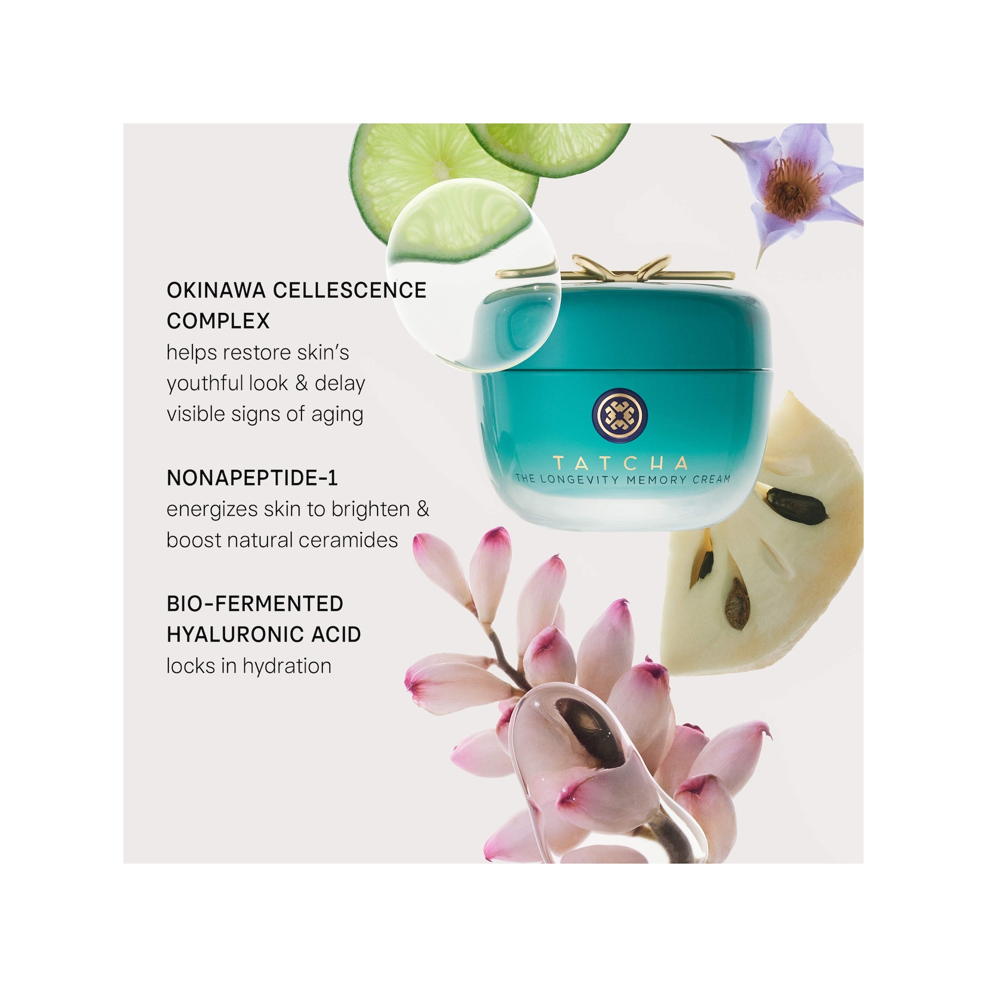 Tatcha The Longevity Youth Restoring Cream for Elasticity & Brightness est une crème gel à mémoire de forme qui aide à restaurer l’apparence jeune de la peau, à retarder les signes visibles de l’âge, à améliorer l’élasticité et à révéler un teint plus lumineux. La Longevity Memory Cream s’inspire du nuchi-gusui, le régime traditionnel d’Okinawa riche en nutriments, composé d’herbes et de plantes ancestrales utilisées depuis des siècles pour favoriser la santé. Réputés pour leur longévité, les habitants d’Okinawa nous rappellent le pouvoir de la nature à nous nourrir et à prendre soin de nous à tout âge. Retardez les signes visibles du vieillissement avec la crème Tatcha The Longevity Memory Cream, un soin hydratant jeunesse conçu pour améliorer l'élasticité et la souplesse de la peau. Agissant pour redonner à la peau un aspect plus jeune, ce soin contribue à lui conférer un teint plus lumineux et éclatant. Formulé à partir du complexe Okinawa Cellescence de Tatcha, ce soin hydratant contient des extraits botaniques d'Okinawa utilisés depuis toujours pour favoriser la longévité. Ces extraits contribuent au renouvellement cellulaire. Il contient également du nonapeptide-1, qui dynamise la peau et soutient la production naturelle de céramides, tandis que l'acide hyaluronique biofermenté assure une hydratation optimale. Adaptée à tous les types de peau, la crème Tatcha The Longevity Memory Cream est une solution de soin non comédogène et testée dermatologiquement.